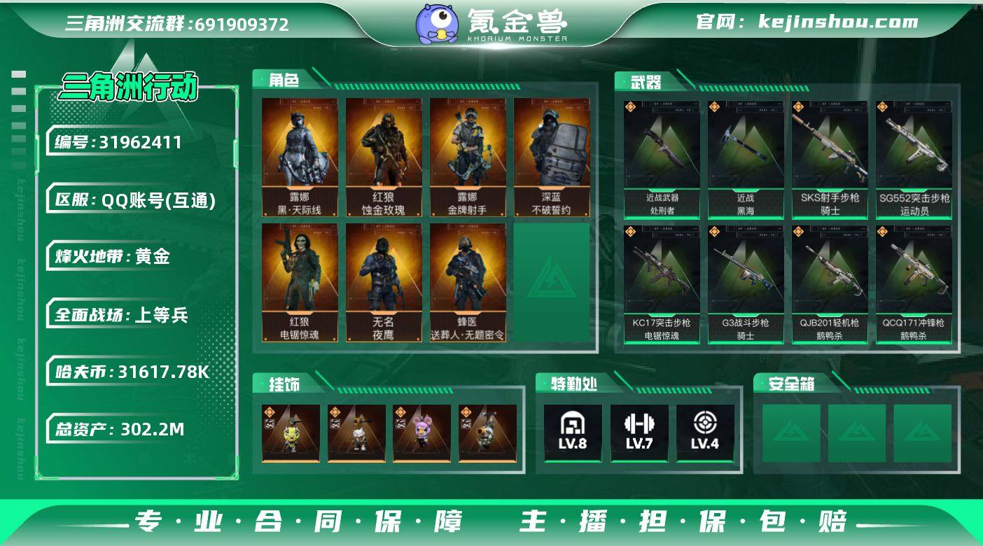 实名:不可二次实名 总资产:302.2M 哈夫币:31617.78K 烽火地带段位:黄金 烽火地带等级:60 全面战场段位:上等兵 全面战场等级:38 8级仓库,7级训练中心,4级靶场,5级指挥中心,0级潜水中心,3级防具台,3级工作台,3级制药台,3级技术中心,1级收藏室 战术部门等级:3 战斗部门等级:2 医疗部门等级:3 研发部门等级:1 后勤部门等级:1 曼德尔砖-气象感应:0 曼德尔砖-命运王牌:0 曼德尔砖-电玩高手:1 曼德尔砖-美杜莎:0