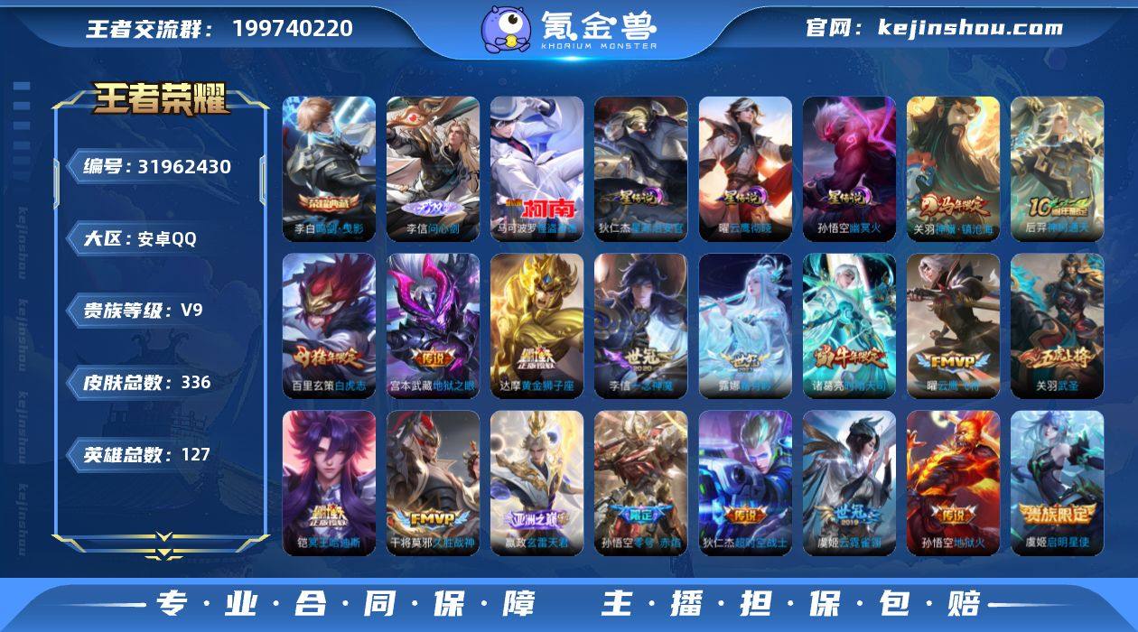 1省标,3市标,20县标,16按键,改名卡,梅西,至尊宝,蓝屏警告,狮心王【英雄全皮】:孙权全皮,猪八戒全皮,敖隐全皮,影全皮【荣耀典藏】:李白鸣剑曳影【无双皮肤】:李信问心剑【珍品传说】:马可波罗怪盗基德【传说皮肤】:韩信踏浪归,关羽神骥镇沧海,后羿神树通天,嬴政玄雷天君,铠冥王哈迪斯,露娜霜月吟,诸葛亮时雨天司,铠绛天战甲,虞姬启明星使,孙悟空零号赤焰,关羽武圣,曜云鹰飞将,李信一念神魔,干将莫邪久胜战神,虞姬云霓雀翎,达摩黄金狮子座,百里玄策白虎志,宫本武藏地狱之眼,孙悟空地狱火,狄仁杰超时空战士【限定皮肤】:白起狰,铠冥王哈迪斯,暃埋骨钱,大乔绒语心约,虞姬夏日便利店,李白谪仙醉月,狄仁杰阴阳师,虞姬凯尔特女王,赵云皇家上将,赵云引擎之心,赵云龙胆,墨子神迹守卫,妲己时之彼端,嬴政优雅恋人,嬴政白昼王子,孙尚香蔷薇恋人,鲁班七号狮舞东方,庄周蜃楼王,庄周云端筑梦师,庄周高山流水,高渐离死亡摇滚,阿轲迷踪丽影,孙膑妖精王,孙膑天狼运算者,扁鹊炼金王,芈月重明,芈月幻夜卜梦,吕布猎兽之王,吕布御风骁将,周瑜赤莲之焰,元歌云间偶戏,夏侯惇朔风刀,甄姬游园惊梦,曹操烛龙,典韦穷奇,典韦蓝屏警告,典韦岱宗,马可波罗逐梦之星,马可波罗暗影游猎,狄仁杰魔术师,狄仁杰万华元夜,达摩星际陆战队,达摩沙漠行僧,项羽海滩派对,项羽霸王别姬,老夫子醍醐杖,老夫子航海奇遇记,关羽武圣,程咬金演武夺筹,刘邦夺宝奇兵,韩信逐梦之影,韩信飞衡,韩信傲雪梅枪,兰陵王驯魔猎人,兰陵王金庭之子,花木兰青春决赛季,花木兰瑞麟志,花木兰默契交锋,亚瑟狮心王,亚瑟潮玩骑士王,孙悟空至尊宝,孙悟空大圣娶亲,孙悟空零号赤焰,牛魔御旌,牛魔奔雷神使,后羿如梦令,李元芳银河之约,李元芳云中旅人,虞姬启明星使,钟馗神迹守卫,钟...