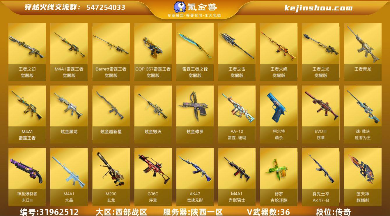 段位:传奇 VIP等级:VIP3 V武器数:36 王者武器数:12 炫金武器数:4 王者之幻-觉醒版,M4A1-雷霆王者-觉醒版,Barrett-雷霆王者-觉醒版,COP 357-雷霆王者-觉醒版,雷霆王者之锋-觉醒版,王者之击-觉醒版,王者火魄-觉醒版,王者之光-觉醒版,王者青龙,M4A1-雷霆王者 炫金黑龙,炫金超新星,炫金毁灭,炫金修罗 AA-12-雷霆-珊瑚,AK47-竞魂无影,EVOⅢ-序章,G36C-序章,魂·裁决-胜者为王,柯尔特-萌杀,M200-玄龙,M4A1-水晶,神圣爆裂者-末日III,M4A1-赤狱骑士,修罗-古蛇迷踪,AK47-B-身先士卒,麒麟刺-堕天神,龙啸-堕天神,AK47-火麒麟,AK47-黑鲨,AK47-黑武士,M4A1-雷神,黑骑士-海王,M4A1-黑骑士,M4A1-死神,M4A1-黑龙,M4A1-猎神,M200-幻神,Barrett-毁灭,Barrett-极光,Barrett-朱雀,AA-12-雷霆,AK12-天启,QBZ03-金色蔷薇,9A91-烈火,屠龙,擎天,M200-竞技荣光,擎天-竞技荣光,AK47-B-常胜将军,斩神刀-雷暴,AK47-B-战士,AK-47-猩红传说,裁决,天神 王者-零-传说之路,王者玲珑,王者玲珑-小乔 团团,电竞教官-云悠悠,葵,零·纪元,魅影,炫,战地猎狐 M200-幻神音效卡,M4A1-黑骑士音效卡,Barrett-毁灭音效卡