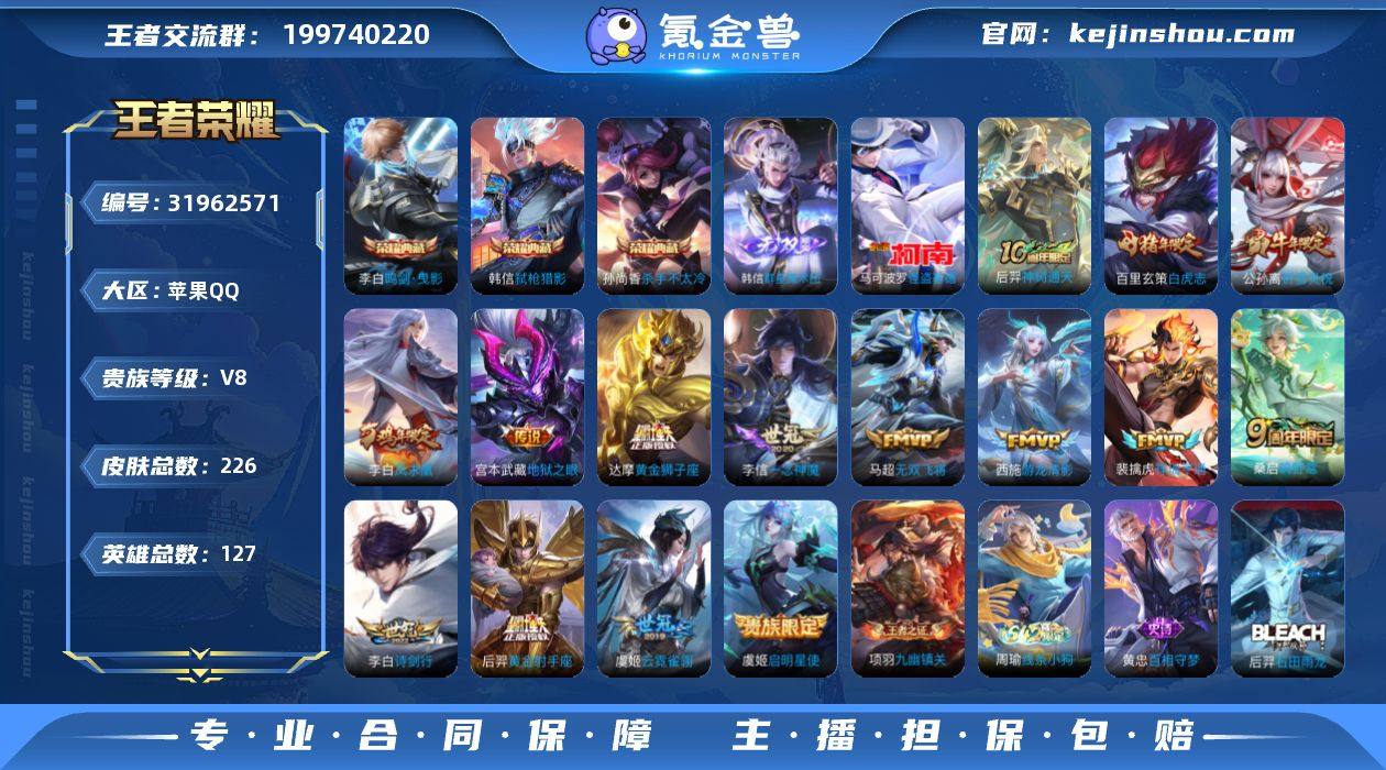 【3水晶1无双1珍品3星传15传说】苹果QQ-127英雄-226皮肤【3水晶】 弑枪猎影 鸣剑·曳影 杀手不太冷【无双皮肤】群星魔术团【珍品传说】怪盗基德【星元皮肤】玉鸾吟星际治安官幽冥之眼【传说皮肤】祥瑞亨通 凤求凰 诗剑行 无双飞将 白虎志 黄金狮子座 祈雪灵祝 地狱之眼 黄金射手座 一念神魔 游龙清影 云霓雀翎 启明星使 鸣野蒿 神树通天【史诗皮肤】星界特工 百相守梦 苍鳞隐世 星界战将 荣光圣徽 星界游侠 顽趣 蔬乡物语 山海·玄木吟 青焰无极 魅语 逐梦之影 傲雪梅枪 辉光之辰 水晶猎龙者 暗隐猎兽者 千年之狐 逐浪之夏 德古拉伯爵 天才门将 电玩小子 狮舞东方 圣诞狂欢 龙骑士 晚萤 梁祝 月团寄思 暗渊魔法 猫狗日记 水果甜心 乘风破浪 青蛇 冰冠公主 摇滚巨星 暗夜贵公子 乱世虎臣 皇家上将 引擎之心 冰雪圆舞曲 游园惊梦 无心 五谷丰年 赏金猎手 节奏热浪 心灵骇客 星夜王子 特工魅影 原初追逐者 舞动绿茵 幽灵船长 功夫厨神 女仆咖啡 魅力维加斯 魔术师 鹰眼统帅 箭羽风息 无限星赏官 鬼剑武藏 【勇者皮肤】劲辣红锅 完美运算 苍威无极 古海寻踪 妄想特派 剑破天穹 探海日志 春野之旅 云中旅人 暖冬·兔眠 龙舞盛年 危途狂花 流音漫舞 破局者 聚星闪耀 蔬乡物语 海盐诗旅 漠中幻影 功夫炙烤 归虚梦演 玩趣恶龙 未来纪元 龙腾万里 幻乐之宴 街头霸王 教廷特使 阿尔法小队 兔女郎 炽热元素使 特工战影 功夫老勺 敏锐之力 黑猫爱糖果 虎啸剑宗 万事如意 纽约教父 秘密基地 哥特玫瑰 乓乓大师 野性能量 红桃皇后 虹云星官 神迹守卫 次元突破 西部大镖客 鲨炮海盗猫 坚韧之力 天使之翼 海滩派对 丁香结 死亡骑士 缤纷绘卷 忍·炎影 白执事 花好人间 海滩丽影 归虚梦演 擒涛扼浪 圆桌骑士 大漠名商 潮玩探月行 蔚蓝守将 胡桃狂想曲 唤灵魔甲 爱心护理 白色死神 救世之瞳 化身博士 星际陆战队 无双福将 拳王 阴阳师 黄...