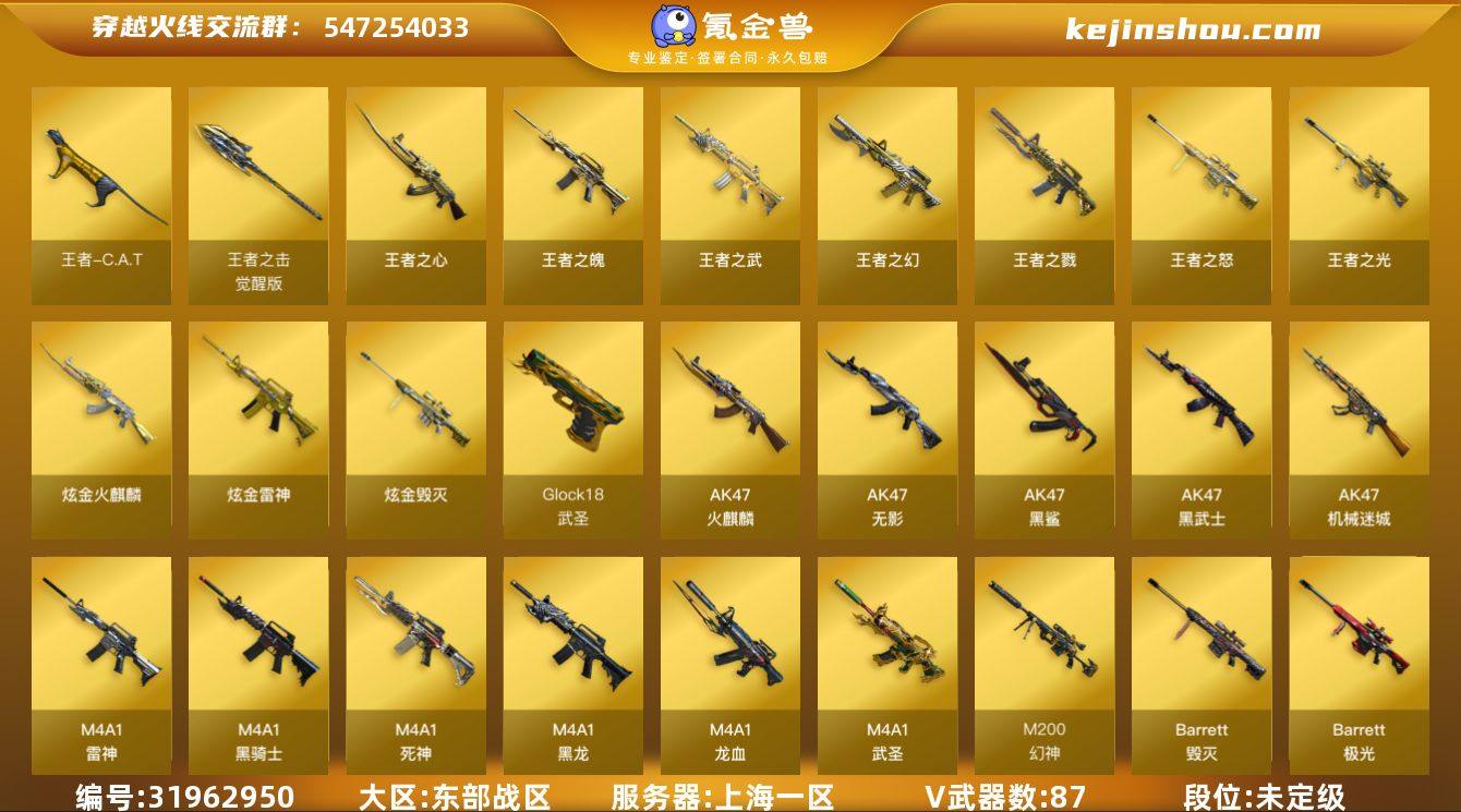 上海一区-90V-11王者-7炫金 【热门武器】:QBZ03-金色蔷薇*2,M200-幻神*2,白虎之魄,C.A.T,M4A1-黑骑士*2,汤姆逊-烈龙*8,RPK-盘龙,加特林-炼狱,沙鹰-修罗*3 【王者炫金武器】:王者之戮,王者之幻,王者之武,王者之魄,王者之心,白虎之魄,王者之光,王者之怒*2,炫金火麒麟,炫金骑士,炫金雷神,炫金武士*2,炫金毁灭*2 【音效卡】:AK47-火麒麟音效卡*3,M4A1-雷神音效卡*2,Barrett-毁灭音效卡,炼狱-百战金芒-庆典舞曲音效卡 【皮肤】:幻神-丹凤,QBZ03-荣耀世冠EP 皮肤,裁决-叶芒苍灵 皮肤,雷神-暗月,雷神-能量核心,雷神-荣耀之魄,M4A1-再燃火线,火麒麟-雷神,毁灭-荣耀之怒,毁灭耀金皮肤,毁灭-星空,无影-能量核心,无影耀金皮肤,战神-粉色甜心皮肤*4,战神-紫绶金章皮肤*10,战神-流金岁月皮肤*8,AWM-天龙-传奇70KG,极光-能量核心,修罗-能量核心*2,修罗-百战金芒 皮肤,龙啸-黯钢战甲 皮肤,轻型军用手斧-再燃火线 【角色】:魅影,妮妮,乔伊教练,修道士,云海玲珑,空,娟娟,卡塔琳娜,潘多拉-甜心教官,铁骑-乘风破浪,新娜塔莎,雅典娜 【人偶武器】:火麒麟-灵狐*2,M37-葵,COP-旗袍,C.A.T,迷你生化手雷,深渊终结者手雷,闪光弹-小乔 【挑战大师】:激光毁灭者III-白马银枪 【英雄级武器】:AK47-火麒麟*2,M4A1-黑龙*2,M4A1-雷神*3,M4A1-黑骑士*2,AK47-无影,M4A1-死神,AK47-黑武士*3,M4A1-武圣,AK47-机械迷城,AK47-黑鲨*2,M4A1-龙血*2,QBZ03-金色蔷薇*2,AK-47-猩红传说*11,AK47-B-战神,AWM-天龙,Barrett-毁灭*3,Barrett-极光,AWM-裁决*2,M200-幻神*2,RPK-盘龙,加特林-炼狱,炼狱-百战金芒,汤姆逊-烈龙*8,烈龙-悦心-觉醒版,AA-12-雷霆,沙鹰-修罗*3,沙鹰-天神,Glock18-武圣,屠龙*2,龙啸*2,擎天,