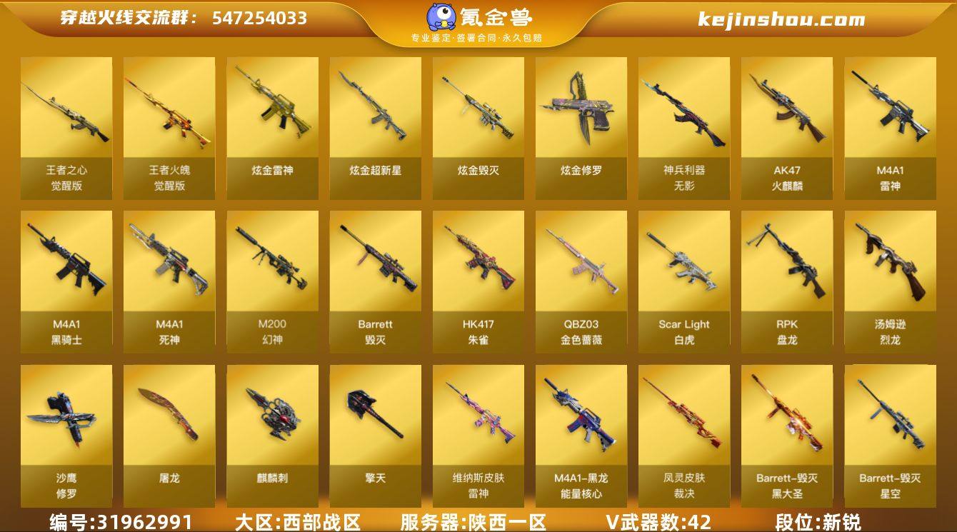 陕西一区-45V-3王者-4炫金 【热门武器】:QBZ03-金色蔷薇,Scar Light-白虎,HK417-朱雀,M200-幻神,M4A1-黑骑士,汤姆逊-烈龙*7,RPK-盘龙*6,斯泰尔-蝴蝶,沙鹰-修罗*4,金刚伞 【王者炫金武器】:炫金雷神,炫金超新星,炫金毁灭,炫金修罗 【皮肤】:AWM-裁决-凤灵皮肤,雷神-维纳斯皮肤,毁灭-星空,毁灭-黑大圣皮肤,黑龙-能量核心,麒麟刺-甜蜜糖果 皮肤 【角色】:葵,樱,电竞教官-云悠悠,风暴女*2,嘉年华灵狐,灵狐者-七夕宝贝,灵狐者-职业经理,龙儿-小淘气,麻雀,曼陀罗-礼服,潘多拉-X,青霞仙子,赛斯-X,斯沃特-X,兔囡囡 【人偶武器】:斯泰尔-蝴蝶,COP-旗袍,迷你生化手雷,灵狐娃娃手雷 【挑战大师】:冰龙粉碎者-白马银枪*2,神圣爆裂者-末日III 【英雄级武器】:AK47-火麒麟,M4A1-雷神,M4A1-黑骑士,M4A1-死神,HK417-朱雀,Scar Light-白虎,无影-神兵利器,QBZ03-金色蔷薇,王者之心-觉醒版,王者火魄-觉醒版,Barrett-毁灭,M200-幻神,RPK-盘龙*6,炼狱-悦蓝-觉醒版,汤姆逊-烈龙*7,沙鹰-修罗*4,屠龙,擎天,麒麟刺,高爆手雷-竞技荣光*4,闪光弹-竞技荣光*4,烟雾弹-竞技荣光*4 【道具】:背包-葫芦兄弟,黄金生化钩,生化弹匣,夺命之镰,防化服,金色流光-枪王排位*2,斯沃特表情,EP战队名片,C4-沙漠,防弹头盔,防弹衣,C4工具钳,手雷包 【特殊枪械】:蝴蝶斯泰尔+6烈龙,1白虎,1黑骑士,6烈龙,6盘龙,1蝴蝶斯泰尔