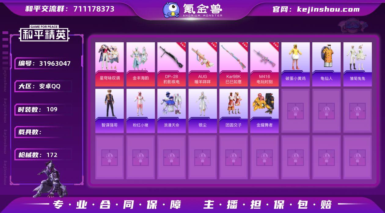 DSH2309【地铁满天赋2粉装-6特效枪AUG-暖羊咩咩[5级]2螳螂】安卓手Q-2粉装-6特效枪-109套装-172枪皮-8王牌印记-不朽星钻Ⅲ-45928热力值【2粉装】金丰海韵,星穹咏叹调【6特效枪】Mk14-福马献瑞[5级],PKM-萌骑夺宝[2级],Kar98K-巳巳如意[5级],AUG-暖羊咩咩[5级],DP-28-豹影疾电[5级],M416-电玩时刻[5级]【2稀有】浪漫天命,M24-奇异狩猎者【8飞行器】异域银装飞行器,狂鲨锋刃飞行器,炫彩糖果飞行器,破刃行动尾迹,冰柠泡泡飞行器,顶峰精英尾迹,粉色滑翔尾迹,万象金身飞行器【1头盔】深海小丑鱼头盔【1背包】金羽特工背包【271其它衣服和枪皮】甜蜜菠萝,幻世战舞者,黄色运动,长空猛禽,燃烧卡路里,智谋强哥,龙魂突击队,蓝色运动,坚韧舞者,小熊娃娃,SS21特训,SS27特训,鱼渊荷华,星途旅人,香桃花海,角色-银尘,角色-8号机,海盐绵绵冰,龟仙人,角色-鲛海歌灵,SS36特训,角色-许七安,SS30特训,雪国风尚,角色-紫俏灵猫,完美偶像,白色伏地魔,纯真浪花,清新柠檬,曼妙人鱼,甜蜜告白,恋语绒绒,特训学院,探宝勇士,元素星魂,狙击之神,都市漫游者,SS26特训,猛禽,疯狂小兔子,红色运动,白熊同盟,风迹短诗,空岛之星,大橘大利,角色-狂花道·娜可露露,湖畔霞光,SS28特训,绮丽涂鸦,萝兰蝴蝶,黄色名流,SS32特训,海岛探路者,SS34特训,冰河战士,凌霄紫焰,竞技名士,云朵鹅,街头风暴,SS22特训,绯格组合,热血青春,角色-湖雨初晴,雪绒豹,雏菊兔兔,黑色伏地魔,幻影武者,铁血战翼,角色-乐音,旭日情侣,SS20特训,琴音绮想,魅力单车,角色-听雨铃兰,青玉碎影,粉红小猪,云魄琉璃,热情海星,粉黛兰香,顶瓜瓜,粉日山川,湖蓝色名流,燕燕于飞,破蛋小黄鸡,金耀舞者,蝶变,森林游猎者,午间小调,角色-Mark.06,SS29特训,团圆交子,SS35特训,巳巳如意,缤纷果语,战术大师,朱霞炽焰,SS24特训,青翼流星,画境星梦,SS33特训,角色-馥郁金蕊,青涩时光,SS37特训