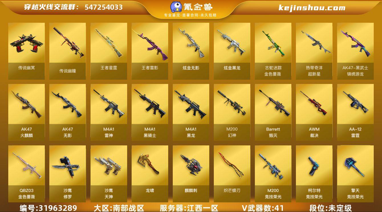 江西一区-43V-9王者-2炫金 【传说武器】:传说幽瞳,传说幽冥 【热门武器】:传说幽瞳,传说幽冥,G36C-幻影,QBZ03-金色蔷薇*2,M200-幻神*2,金色蔷薇-古蛇迷踪,修罗-古蛇迷踪,M200-竞技荣光,M4A1-黑骑士,白虎-枪娘安妮,沙鹰-修罗,炽芒蝶刃*2,炽芒蝶刃-破浪逐光 皮肤*2 【王者炫金武器】:王者雷影*2,王者星霆,炫金无影,炫金黑龙 【音效卡】:修罗-古蛇迷踪音效卡,AK47-火麒麟音效卡,M4A1-雷神音效卡,死神-雪域霜狐-怀旧音效卡 【皮肤】:金色蔷薇-量子蔷薇 皮肤,AWM-裁决-凤灵皮肤,雷神-航星皮肤,火麒麟-白虎,火麒麟-巅峰荣耀,毁灭-星空,黑骑士-典雅胡桃 皮肤,幻影-破浪逐光 皮肤,龙啸-醒狮 皮肤,炽芒蝶刃-破浪逐光 皮肤*2 【角色】:隼,隐,王者沙漠玫瑰,雪域霜狐,蛇隐宗,奇洋探员,芳心审判者,飞虎队-X,风暴女,荆棘玫瑰,兰妹妹,猎狐者-追月,灵狐-花神,龙儿,麻雀,曼陀罗-礼服,蛇姬,蜀雪,维纳斯,雪莉杨,雪莉杨-摸金校尉 【人偶武器】:天龙-曼陀罗,白虎-枪娘安妮,迷你宝贝,Scar Light-马枪,迷你裂空之翼,迷你牛牛,沙鹰-夜玫瑰 【暴走生化】:超级对讲机 【英雄级武器】:AK47-火麒麟,M4A1-黑龙,M4A1-雷神,M4A1-黑骑士,AK47-无影,G36C-幻影,黑武士-锦绣游龙,超新星-热带奇洋,金色蔷薇-古蛇迷踪,死神-雪域霜狐,QBZ03-金色蔷薇*2,王者之翼-觉醒版,王者冰魄-觉醒版,王者火魄-觉醒版,王者风势-觉醒版,Barrett-毁灭,AWM-裁决,M200-幻神*2,M200-竞技荣光,Barrett-金色蔷薇,王者凰鸣-觉醒版,AA-12-雷霆,王者之霆-觉醒版,沙鹰-修罗,沙鹰-天神*3,柯尔特-竞技荣光,修罗-古蛇迷踪,龙啸,麒麟刺,擎天-竞技荣光,炽芒蝶刃*2,龙啸-热带奇洋,高爆手雷-竞技荣光*6,手雷-热带奇洋,高爆手雷-古蛇迷踪,闪光弹-竞技荣光*3,烟雾弹-竞技荣光*4,烟雾...