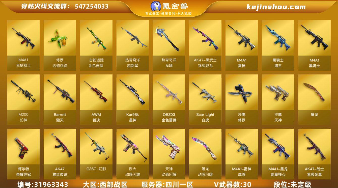 四川一区-32V-4王者-0炫金 【热门武器】:G36C-幻影,QBZ03-金色蔷薇,Scar Light-白虎,M200-幻神,金色蔷薇-古蛇迷踪,修罗-古蛇迷踪,死亡之眼,荣耀世冠-柯尔特,Kar98K-星神,M4A1-黑骑士,雷神-小红,沙鹰-修罗 【音效卡】:屠龙-动感闪耀 音效卡,Kar98K-星神音效卡,炼狱-百战金芒-庆典舞曲音效卡 【皮肤】:幻神-星火小队签名臻藏版 皮肤,ScarLight-白虎-冠军之虎皮肤,白虎-白鲨-CFPLS23冠军,QBZ03-CFS2024 皮肤,金色蔷薇-电竞之星 皮肤,裁决-羽掣 皮肤,裁决-胜者为王 皮肤,雷神-虎将,M4A1-再燃火线,毁灭-暗月,毁灭-虹光风暴 皮肤,毁灭-秦师 皮肤,黑龙-能量核心,战神-紫绶金章皮肤,屠龙-小叮当 皮肤,轻型军用手斧-再燃火线 【角色】:蛇隐宗,奇洋探员,乔伊教练,暗夜-X,芳心审判者,飞虎队-X,风暴女,嘉年华灵狐,兰-海滩派对,猎狐者-追月,灵狐者-黄金海岸,潘多拉-X,潘多拉-甜心教官,蛇姬,斯沃特-X,游珑儿 【人偶武器】:雷神-小红,天龙-曼陀罗,AWM-灵狐-15周年嘉年华,迷你波特博士,迷你生化手雷,生化手雷-机甲核心*2,灵狐娃娃手雷 【暴走生化】:死亡之眼,超级对讲机 【挑战大师】:冰龙粉碎者-白马银枪,激光毁灭者III-白马银枪,神圣爆裂者-末日III 【英雄级武器】:M4A1-雷神,M4A1-黑骑士,Scar Light-白虎,G36C-幻影,黑武士-锦绣游龙,超新星-热带奇洋,金色蔷薇-古蛇迷踪,QBZ03-金色蔷薇,烈火-动感闪耀,AK-47-猩红传说,黑骑士-海王,Barrett-毁灭,AWM-裁决,M200-幻神,Kar98K-星神,沙鹰-修罗,沙鹰-天神,荣耀世冠-柯尔特,柯尔特-电竞之星,天神-动感闪耀,修罗-古蛇迷踪,屠龙,屠龙-动感闪耀,龙啸-热带奇洋,麒麟刺-百战金芒,手雷-动感闪耀,手雷-热带奇洋,高爆手雷-古蛇迷踪,闪光弹-云龙,闪光弹-雷霆王者-觉醒版*3,烟雾弹-古蛇迷踪,M4A1-赤...