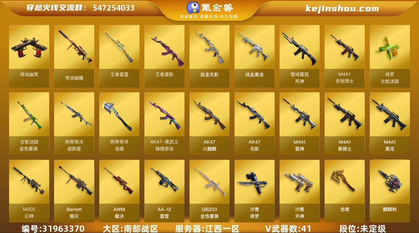 江西一区-43V-9王者-2炫金 【传说武器】:传说幽瞳,传说幽冥 【热门武器】:传说幽瞳,传说幽冥,G36C-幻影,QBZ03-金色蔷薇*2,M200-幻神*2,金色蔷薇-古蛇迷踪,修罗-古蛇迷踪,M200-竞技荣光,M4A1-黑骑士,白虎-枪娘安妮,沙鹰-修罗,炽芒蝶刃*2,炽芒蝶刃-破浪逐光 皮肤*2 【王者炫金武器】:王者雷影*2,王者星霆,炫金无影,炫金黑龙 【音效卡】:修罗-古蛇迷踪音效卡,AK47-火麒麟音效卡,M4A1-雷神音效卡,死神-雪域霜狐-怀旧音效卡 【皮肤】:金色蔷薇-量子蔷薇 皮肤,AWM-裁决-凤灵皮肤,雷神-航星皮肤,火麒麟-白虎,火麒麟-巅峰荣耀,毁灭-星空,黑骑士-典雅胡桃 皮肤,幻影-破浪逐光 皮肤,龙啸-醒狮 皮肤,炽芒蝶刃-破浪逐光 皮肤*2 【角色】:隼,隐,王者沙漠玫瑰,雪域霜狐,蛇隐宗,奇洋探员,芳心审判者,飞虎队-X,风暴女,荆棘玫瑰,兰妹妹,猎狐者-追月,灵狐-花神,龙儿,麻雀,曼陀罗-礼服,蛇姬,蜀雪,维纳斯,雪莉杨,雪莉杨-摸金校尉 【人偶武器】:天龙-曼陀罗,白虎-枪娘安妮,迷你宝贝,Scar Light-马枪,迷你裂空之翼,迷你牛牛,沙鹰-夜玫瑰 【暴走生化】:超级对讲机 【英雄级武器】:AK47-火麒麟,M4A1-黑龙,M4A1-雷神,M4A1-黑骑士,AK47-无影,G36C-幻影,黑武士-锦绣游龙,超新星-热带奇洋,金色蔷薇-古蛇迷踪,死神-雪域霜狐,QBZ03-金色蔷薇*2,王者之翼-觉醒版,王者冰魄-觉醒版,王者火魄-觉醒版,王者风势-觉醒版,Barrett-毁灭,AWM-裁决,M200-幻神*2,M200-竞技荣光,Barrett-金色蔷薇,王者凰鸣-觉醒版,AA-12-雷霆,王者之霆-觉醒版,沙鹰-修罗,沙鹰-天神*3,柯尔特-竞技荣光,修罗-古蛇迷踪,龙啸,麒麟刺,擎天-竞技荣光,炽芒蝶刃*2,龙啸-热带奇洋,高爆手雷-竞技荣光*6,手雷-热带奇洋,高爆手雷-古蛇迷踪,闪光弹-竞技荣光*3,烟雾弹-竞技荣光*4,烟雾...