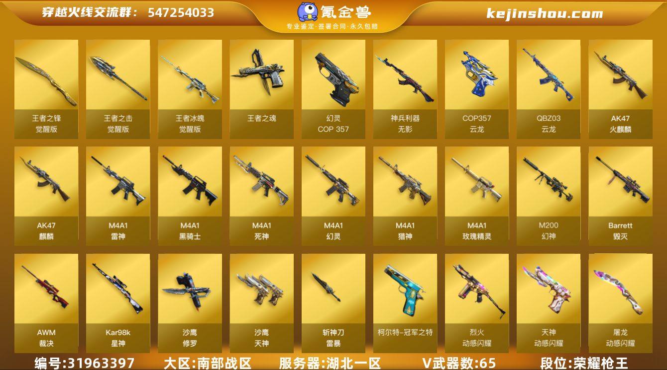 湖北一区-68V-4王者-0炫金 【热门武器】:M200-幻神,QBZ03-街机,柯尔特-冠军之特,Kar98K-星神,M4A1-黑骑士,斯泰尔-蝴蝶,MK5-炽火炎龙,白虎-枪娘安妮,USP-雷暴,COP 357-幻灵,沙鹰-修罗*5 【王者炫金武器】:王者之魂 【皮肤】:幻神-宠儿-2021MVP,M200-幻神-N9-2022MVP,雷神-传奇N9,M4A1-战神赵云,雷神-维纳斯皮肤,火麒麟-战神关羽,火麒麟-心动糖果,毁灭-冠军之怒,毁灭-战神张飞,毁灭-直播专属,M4A1-千变-孔明皮肤,黑骑士-战神马超,麒麟刺-甜蜜糖果 皮肤 【角色】:隼,机械姬,华,王者影豹,乔伊教练,云海玲珑,飞虎队-X,风暴女,嘉年华灵狐,娟娟,零-热舞青春,曼陀罗-X,女主播,潘多拉-X,斯沃特-X,维纳斯,游珑儿 【人偶武器】:白虎-枪娘安妮,MK5-炽火炎龙,斯泰尔-蝴蝶,AWM-灵狐-15周年嘉年华 【挑战大师】:神圣爆裂者III,AK47-冰龙粉碎者,激光毁灭者III-白马银枪,激光毁灭者III 【英雄级武器】:AK47-火麒麟,AK47-麒麟,M4A1-雷神,M4A1-黑骑士,M4A1-死神,M4A1-幻灵,无影-神兵利器,QBZ03-云龙,M4A1-玫瑰精灵,M4A1-猎神,烈火-动感闪耀,王者冰魄-觉醒版,加利尔ACE-天袭,Barrett-毁灭*2,AWM-裁决,M200-幻神,Kar98K-星神,沙鹰-修罗*5,沙鹰-天神,USP-雷暴,COP 357-幻灵,柯尔特-冠军之特,COP 357-云龙,天神-动感闪耀,屠龙-动感闪耀,斩神刀-雷暴,王者之锋-觉醒版,王者之击-觉醒版,高爆手雷-雷暴*4,手雷-动感闪耀,高爆手雷-云龙*7,闪光弹-雷暴*5,闪光弹-云龙*4,烟雾弹-雷暴*4,烟雾弹-云龙*5 【道具】:冰冰企鹅背包,炫彩背包,背包-洛丽塔,超级背包,哔哩哔哩名片,夺命之镰,防化服,金色流光-枪王排位*2,星辰流光-枪王排位,枪王排位28赛季金色流光,枪王排位29赛季金色流光,斯沃特表情,动感闪耀表情,防弹头盔,防弹衣,C4工具钳,手雷...
