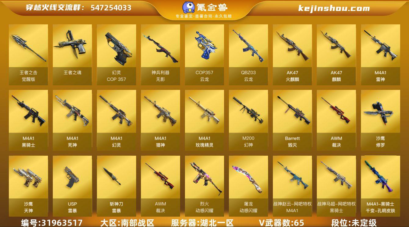 湖北一区-68V-4王者-0炫金 【热门武器】:M200-幻神,QBZ03-街机,柯尔特-冠军之特,Kar98K-星神,M4A1-黑骑士,斯泰尔-蝴蝶,5-炽火炎龙,白虎-枪娘安妮,USP-雷暴,COP 357-幻灵,沙鹰-修罗*5 【王者炫金武器】:王者之魂 【皮肤】:幻神-宠儿-2021MVP,M200-幻神-N9-2022MVP,雷神-传奇N9,M4A1-战神赵云,雷神-维纳斯皮肤,火麒麟-战神关羽,火麒麟-心动糖果,毁灭-冠军之怒,毁灭-战神张飞,毁灭-直播专属,M4A1-千变-孔明皮肤,黑骑士-战神马超,麒麟刺-甜蜜糖果 皮肤 【角色】:隼,机械姬,华,王者影豹,乔伊教练,云海玲珑,飞虎队-X,风暴女,嘉年华灵狐,娟娟,零-热舞青春,曼陀罗-X,女主播,潘多拉-X,斯沃特-X,维纳斯,游珑儿 【人偶武器】:白虎-枪娘安妮,5-炽火炎龙,斯泰尔-蝴蝶,AWM-灵狐-15周年嘉年华 【挑战大师】:神圣爆裂者III,AK47-冰龙粉碎者,激光毁灭者III-白马银枪,激光毁灭者III 【英雄级武器】:AK47-火麒麟,AK47-麒麟,M4A1-雷神,M4A1-黑骑士,M4A1-死神,M4A1-幻灵,无影-神兵利器,QBZ03-云龙,M4A1-玫瑰精灵,M4A1-猎神,烈火-动感闪耀,王者冰魄-觉醒版,加利尔ACE-天袭,Barrett-毁灭*2,AWM-裁决,M200-幻神,Kar98K-星神,沙鹰-修罗*5,沙鹰-天神,USP-雷暴,COP 357-幻灵,柯尔特-冠军之特,COP 357-云龙,天神-动感闪耀,屠龙-动感闪耀,斩神刀-雷暴,王者之锋-觉醒版,王者之击-觉醒版,高爆手雷-雷暴*4,手雷-动感闪耀,高爆手雷-云龙*7,闪光弹-雷暴*5,闪光弹-云龙*4,烟雾弹-雷暴*4,烟雾弹-云龙*5 【道具】:冰冰企鹅背包,炫彩背包,背包-洛丽塔,超级背包,哔哩哔哩名片,夺命之镰,防化服,金色流光-枪王排位*2,星辰流光-枪王排位,枪王排位28赛季金色流光,枪王排位29赛季金色流光,斯沃特表情,动感闪耀表情,防弹头盔,防弹衣,C4工具钳,手雷包 【...