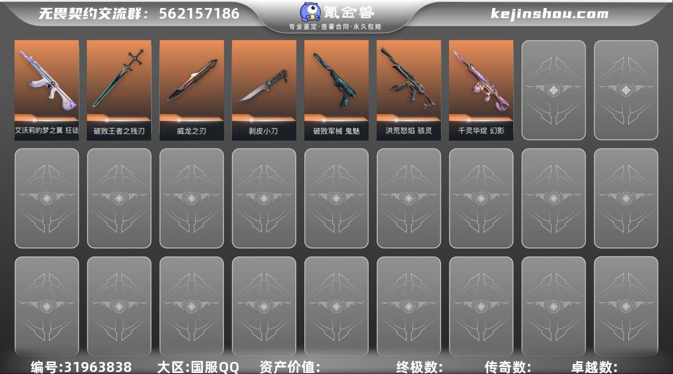XSQY14【游戏等级】Lv169 【段位】 钻石II 【R点】1,090 【皮肤总价值】40,630 【英雄数量】28 【皮肤数量】90 【挂饰数量】86 【卡面数量】114 【喷漆数量】108 【短炮】短炮-好搭档 短炮-末日之翼 短炮-纤云弄巧 短炮-深海水族 【标配】标配-星际猎兵 标配-阿特拉斯指挥部 标配-折光棱晶 标配-VCT25xBLG 标配-荒土机兵 标配-超能偶像 标配-战术熊与伙伴们 【莽侠】莽侠-诡秘蛇影 莽侠-月球哨兵 莽侠-纤云弄巧 莽侠-深海水族 【奥丁】奥丁-末日之翼 奥丁-纳米打击 奥丁-流星兵团 奥丁-天界神兵//2.0 【狂徒】狂徒-诡秘蛇影 狂徒-虚空遗器 狂徒-偃月苍龙 狂徒-海洋之星 狂徒-荒土机兵 狂徒-掠影 狂徒-流星兵团 狂徒-盖亚的复仇 狂徒-塑水宗 狂徒-洪荒怒焰 狂徒-冰点凝冻 【戍卫】戍卫-折光棱晶 戍卫-月球哨兵 戍卫-逆冲蛮牛 戍卫-天界神兵 戍卫-战术熊与伙伴们 戍卫-珍珠棘贝 【飞将】飞将-末日之翼 飞将-战术熊与伙伴们 【蜂刺】蜂刺-折光棱晶 蜂刺-星云暗涌 蜂刺-纤云弄巧 蜂刺-深海水族 【判官】判官-诡秘蛇影 判官-纳米打击 判官-天界神兵//2.0 【近战武器】近战武器-神圣领域战刀 近战武器-荒土机兵热能刀 近战武器-鬼丸国纲 近战武器-RGX11zPro//3.0爪刀 近战武器-流星兵团短剑 近战武器-珍珠棘贝短剑 近战武器-天御刀 【鬼魅】鬼魅-星云暗涌 鬼魅-流星兵团 鬼魅-破败军械 【冥驹】冥驹-星云暗涌 冥驹-荒土机兵 冥驹-堕天遗武 冥驹-复古浪潮 【幻影】幻影-侦察力量 幻影-神圣领域 幻影-781-A协议 幻影-纳米打击 幻影-珍珠棘贝 幻影-天界神兵//2.0 【獠犬】獠犬-神圣领域 獠犬-全息波普 獠犬-逆冲蛮牛 獠犬-复古浪潮 【骇灵】骇灵-星云暗涌 骇灵-荒土机兵 骇灵-流星兵团 骇灵-珍珠棘贝 【雄鹿】雄鹿-月球哨兵 雄鹿-逆冲蛮牛 雄鹿-复古浪潮 【战神】战神-神圣领域 战神-深海水族 【狂怒】狂怒-神圣领域 狂怒-...