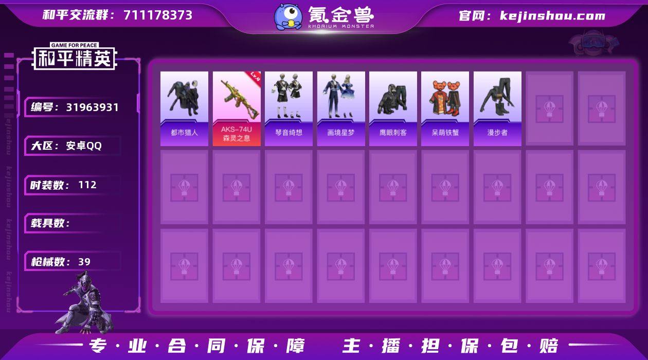 【特价出售】安卓Q-1稀有4特效枪3热门24套装39枪皮 8774热力值 历史荣耀皇冠Ⅴ 【1稀有】 都市猎人 【4特效枪】 AKS-74U-森灵之息 (4级) AKS-74U-森灵之息 (4级) Mk14-福马献瑞 (5级) AA12-G-萌骑幻想 (4级) 【3热门】 呆萌铁蟹 鹰眼刺客 漫步者 【1头盔】 深海小丑鱼头盔