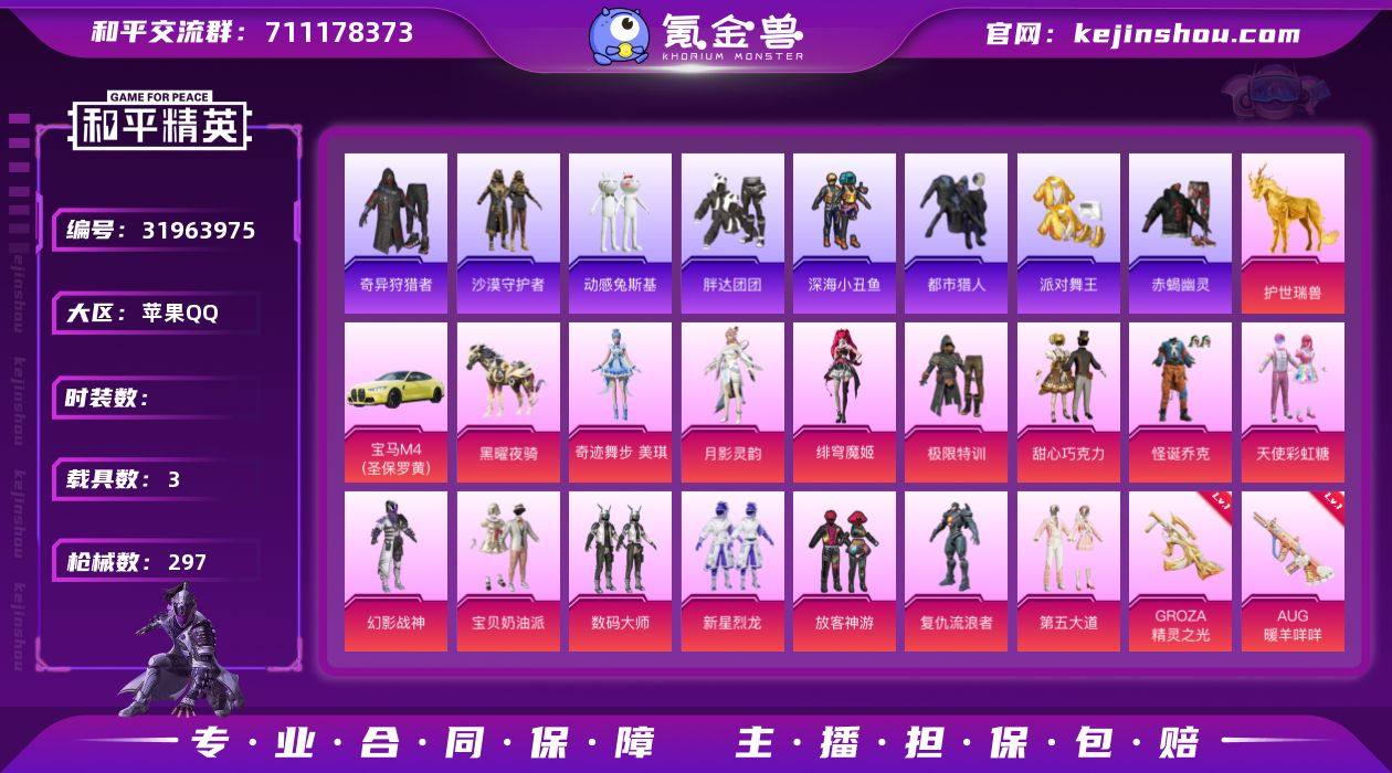 赤蝎 都市 金鞋 巧克力 怪诞 放客 极限特训 黑丝 双马尾 胖达 国宝头 粉熊包 满地铁天赋】c26651-【无二次】【因赛季更新游戏段付以上号为准!】 苹果Q-7稀有3载具15粉装12特效枪21热门206套装297枪皮 17印记 历史无敌战神 【7稀有】 奇异狩猎者 赤蝎幽灵 AKM-缤纷海域 都市猎人 浪漫天命 派对舞王 派对舞王(金靴子) 【3载具】 宝马M4(圣保罗黄) 护世瑞兽 黑曜夜骑 【15粉装】 奇迹舞步美琪 绯穹魔姬 宝贝奶油派 天使彩虹糖 甜心巧克力 异瞳寒姬 月影灵韵 怪诞乔克 幻影战神 放客神游 数码大师 极限特训 第五大道 新星烈龙 复仇流浪者 【12特效枪】 M416-五爪金龙 (7级) SCAR-L-金蛇镇世 (3级) Kar98K-巳巳如意 (5级) M762-青锋波束 (5级) DP-28-豹影疾电 (5级) AUG-暖羊咩咩 (5级) GROZA-精灵之光 (2级) M417-第五大道 (1级) GROZA-旋转彩虹 (7级) AKS-74U-森灵之息 (5级) Vector-环太平洋 (7级) AKM-暮色玫影(3级) 【21热门】 Mark.06 龟仙人 幸运萌趣趣 仓鼠灰灰 动感兔斯基 糯粉咩咩 鹰眼刺客 沙漠守护者 深海小丑鱼 胖达团团 TT战队服 暗影哥特 水银刺客 狂沙舞者 漫步者 破蛋小黄鸡 极速红龙 军刀雅典娜 英勇保护者 弄潮海豚 S686-奇异狩猎者 【1飞行器】 黄族统领飞行器 【2头盔】 国宝胖达头盔 甜心宝贝头盔 【2背包】 甜心宝贝背包 萌熊伴侣背包