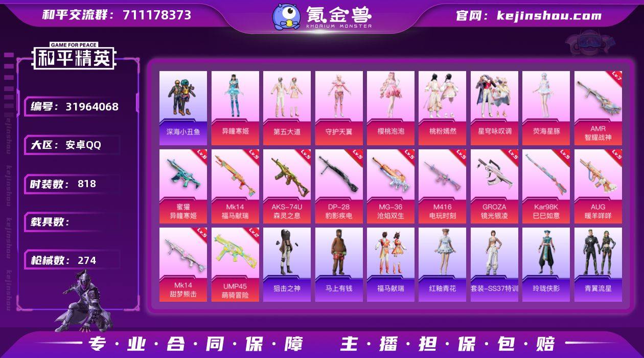 实名: 可修改 时装数: 818 枪械数: 274 战备数: 231 热门装扮: 呆萌铁蟹,深海小丑鱼,迅捷狂鲨,第五大道,守护天翼,樱桃泡泡,桃粉嫣然,星穹咏叹调,荧海星豚,异瞳寒姬 稀有枪皮: M416电玩时刻,GROZA-镜光银凌,Kar98K-巳巳如意,AUG-暖羊咩咩,AMR-智耀战神,MK14-甜梦熊击,DP-28-豹影疾电,MG-36-沧焰双生,蜜獾-异瞳寒姬,AKS-74U-森灵之息,UMP45-萌骑冒险