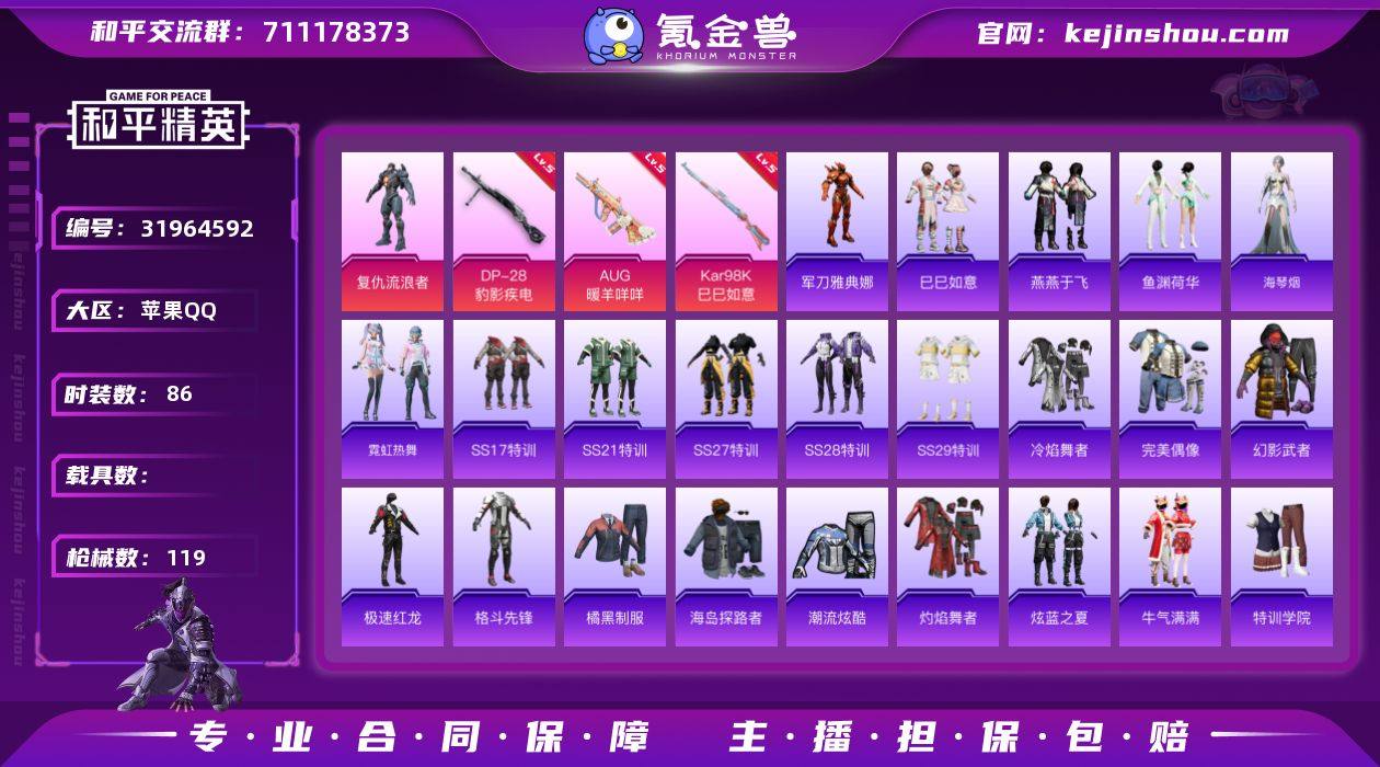 苹果 手Q-1粉装-5特效枪-0载具-0粉色飞行器-30842热力值-2王牌印记-86套装-119枪皮 【热门品类】:角色-军刀雅典娜 【粉色套装】:角色-复仇流浪者 【粉色枪皮等级】:AUG-暖羊咩咩(五级),ACE32-萌骑漫游(二级),Kar98K-巳巳如意(五级),Mk14-福马献瑞(五级),DP-28-豹影疾电(五级) 【粉色枪皮】:AUG-暖羊咩咩,ACE32-萌骑漫游,Kar98K-巳巳如意,Mk14-福马献瑞,DP-28-豹影疾电 【粉色降落伞】:炫彩糖果降落伞 【稀有套装】:套装-巳巳如意,套装-马上来财,套装-燕燕于飞,套装-鱼渊荷华,角色-海琴烟,套装-霓虹热舞,套装-雨过天青,套装-红釉青花 【稀有枪皮】:AKM-破晓战魂,AKM-龙的传人,M16A4-红色方程式,M16A4-蓝色火焰,SCAR-L-炫彩节奏,SCAR-L-玉兔迎春,M416-红色方程式,M416-蓝色火焰,GROZA-治愈之星,AUG-天降萌叽,AUG-耀粉歌者,M762-天降萌叽,AC-VAL-天降萌叽,蜜獾-天降萌叽,蜜獾-娇憨猪猪,UZI-啾咪啾咪,UZI-天降萌叽,UZI-娇憨猪猪,UZI-红色方程式,UMP45-夜灯,UMP45-蓝色火焰,Vector-焰鹰斗篷,Vector-生命誓言,汤姆逊-天降萌叽,汤姆逊-炫彩节奏,汤姆逊-耀粉歌者,P90-巳巳如意,Kar98K-洛神天依,Kar98K-红色方程式,M24-炫彩节奏,AWM-焰鹰斗篷,SKS-炫彩节奏,Mini14-炫彩节奏,Mini14-耀粉歌者,SLR-娇憨猪猪,S686-彩虹符号,S686-红色方程式,S686-巳巳如意,S1897-炫彩节奏,S12K-破晓战魂,S12K-娇憨猪猪,DBS-焰鹰斗篷,DBS-彩虹符号,M249-破晓战魂,M249-糯团青竹,DP-28-焰鹰斗篷,DP-28-彩虹符号,MG3-幻世战舞者,短管霰弹-星穹咏叹调,沙漠之鹰-旋转彩虹,战术弩-江南烟雨,破片手榴弹-巳巳如意 【其他套装】:套装-SS17特训,套装-SS21特训,套装-SS27特训,套装-SS28特训,套装-SS29特训,套装-冷焰舞者,套装-完美偶像,套装-幻影武者,套装-极速红龙,...
