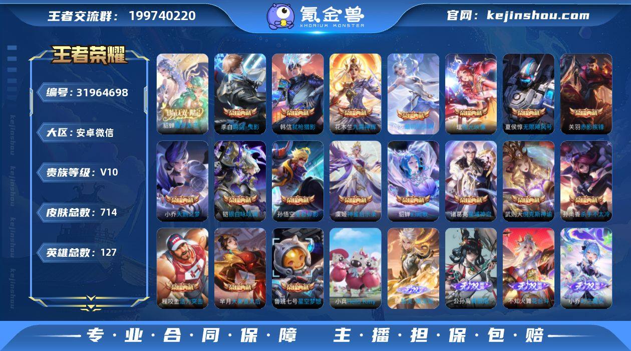 CM2270 安卓微信 女号 V10 713皮 19典藏10无双9珍品传说【4小国 游走54段 发育路41段 全能大师 14热门金标 HelloKitty小兵 77按键11天幕】【1.3W战力小国服张飞/小乔 1.1W战力小国服瑶 小国服王昭君】貂蝉珍品无双 12星元330限定124传说 128幸运值 3385英雄碎片 4831皮肤碎片 2887星币 35印记 15荣耀印记 营地号:1628491057 【珍品传说】怪盗基德,孙策时之奇旅,江户川柯南,器灵·落星盏,兔狲·蓬尾,黑崎一护,朽木白哉,酷洛米之心,大耳狗之梦, 【无 双】花合斗,韩信群星魔术团,真我赫兹瑶,时之魔女,青丘·九尾,碎月剑心,神器·明辉仪,离恨烟,甄姬雪境奇遇,器灵·螭龙剑,馥梦繁花, 【荣耀典藏】九霄神辉,赤影疾锋,全息碎影,鸣剑·曳影,星域神启,武则天,倪克斯神谕,天鹅之梦,无限飓风号,活力突击,星空梦想,杀手不太冷,大秦宣太后,银·白咏叹调,幻阙歌,弑枪猎影,神鉴启示录,拾光映像,最初的交响, 【星元皮肤】金色仲夏夜,幻海之心,幽冥之眼,幽冥火,未来机甲,零号雷霆,时之愿境,时之思念,星际治安官,玉鸾吟,乞巧织春,荆棘舞步, 【热门限定】愿照·众生和,愿照·岁时盈,愿照·千秋盛,愿照·山河定,愿照·九州拓,愿照·福禄聚,器灵·浮梦炉,逐花归海,落雪白狼,凤求凰,至尊宝,乘龙·问璇玑,乘龙·淬吴钩,乘龙·铭钟鼎,乘龙·聚宝船,乘龙·忆丹青,白虎志,青龙志,朱雀志,瑞麟志,玄武志,神威,虎魄,龙胆,烈魂,武圣,李逍遥,冰锋战神,千劫归真,梅西,天魔缭乱,白鹤梁神女,夜都魔契,曦玄引女,曦玄引男,影龙天霄,琥珀纪元马超,琥珀纪元伽罗,琥珀纪元铠,超元猎域,如梦令男,异界灵契,如梦令女,零号·赤焰,深海之息,永曜之星,武陵仙君,时雨天司,御风骁将,祈雪灵祝,奔雷神使,纯白花嫁,真爱至上,傲雪梅枪,天狼狩猎者,天狼绘梦者,天狼运算者,天狼溯光者,天狼征服者,寅虎·赤拳,寅虎·瑞焰,寅虎·心曲,寅虎·展翼,寅虎·御盾,默契交锋男,默契交锋女,逐梦之影,逐梦之...