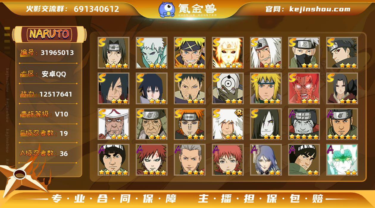 19S36A 有熊猫有大象 1251万战力,战力本随心打 热门忍者有:解斑,金水,十尾带土,须佐止水等 因为连带着QQ一起卖,所以有很多别的游戏的账号打包送给你,可以小刀