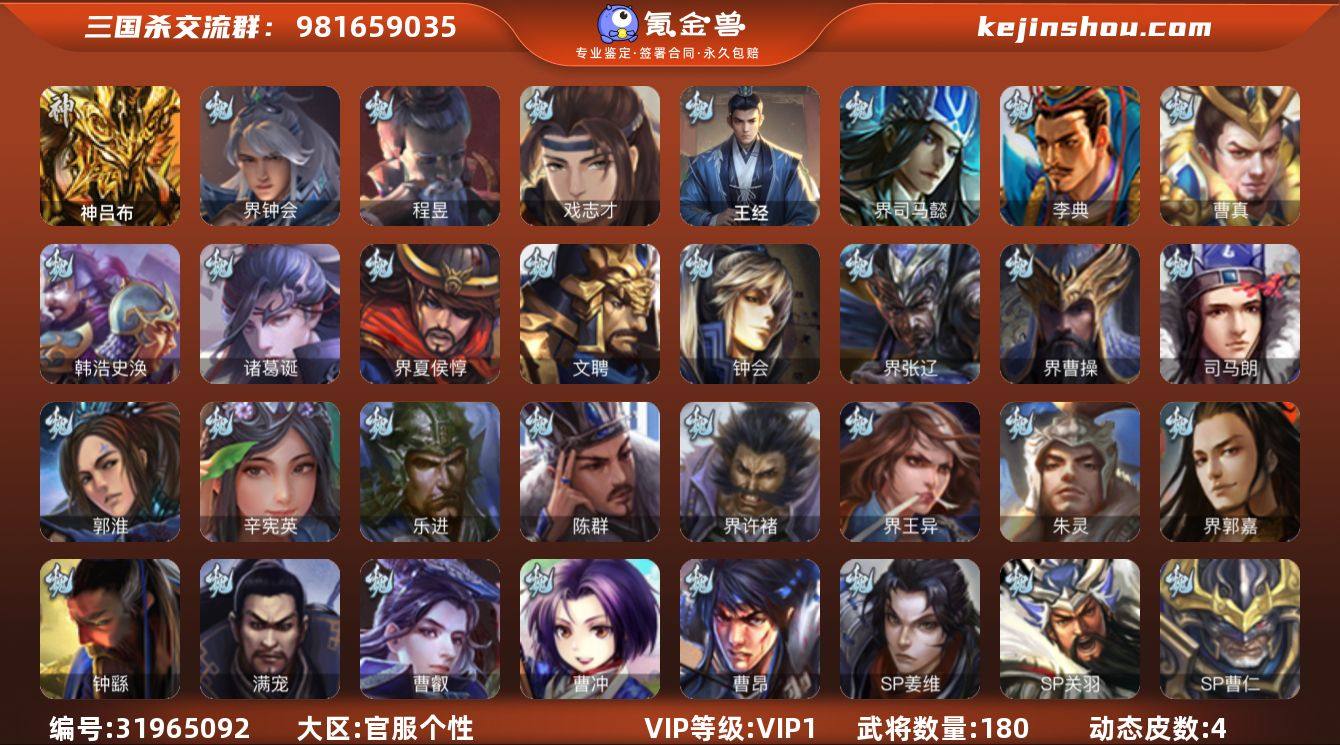 官阶:中军将军;VIP等级:VIP1;史诗武将数量:10;动态皮肤数量:4;武将总数:180;史诗宝珠数量:0;将魂数量:356;神将:1;魏国史诗武将:2;蜀国史诗武将:2;吴国史诗武将:1;群史诗武将:3 神吕布,界钟会,戏志才,程昱,张星彩,谯周,界徐盛,张让,麹义,界李儒,SP关羽,SP曹仁,乐进,曹昂,诸葛诞,朱灵,文聘,SP姜维,钟会,曹冲,郭淮,满宠,界王异,界曹操,界司马懿,界夏侯惇,界张辽,界许褚,界郭嘉,李典,曹真,韩浩史涣,陈群,曹叡,钟繇,司马朗,辛宪英,王经,势陈到,SP孙尚香,关银屏,夏侯霸,马良,关兴张苞,廖化,界马岱,关平,刘封,界法正,界关兴张苞,界刘备,界关羽,SP徐庶,吴懿,周仓,张松,马忠,黄皓,赵统赵广,界伊籍,谋庞统,界张嶷,谋姜维,吴班,诸葛果,甘夫人,大乔小乔,诸葛恪,诸葛瑾,孙鲁育,程普,韩当,潘璋马忠,虞翻,界甘宁,界吕蒙,界黄盖,界周瑜,界大乔,界陆逊,孙鲁班,朱桓,顾雍,孙休,朱治,吕岱,濮阳兴,界全琮,界朱治,张布,伏完,界袁术,张宝,伏皇后,李儒,华雄,袁术,界华佗,公孙瓒,蔡夫人,公孙渊,张鲁,蹋顿,SP黄月英,曹节,界庞德,界公孙瓒,韩遂,贾充,李傕郭汜,张昌蒲-龙年端午(动态),花鬘-依心缱绻(动态),关银屏-兔年春节(动态),陆逊-龙年七夕(动态),徐盛-破军杀将(动态),麹义-扬刀立威(动态)