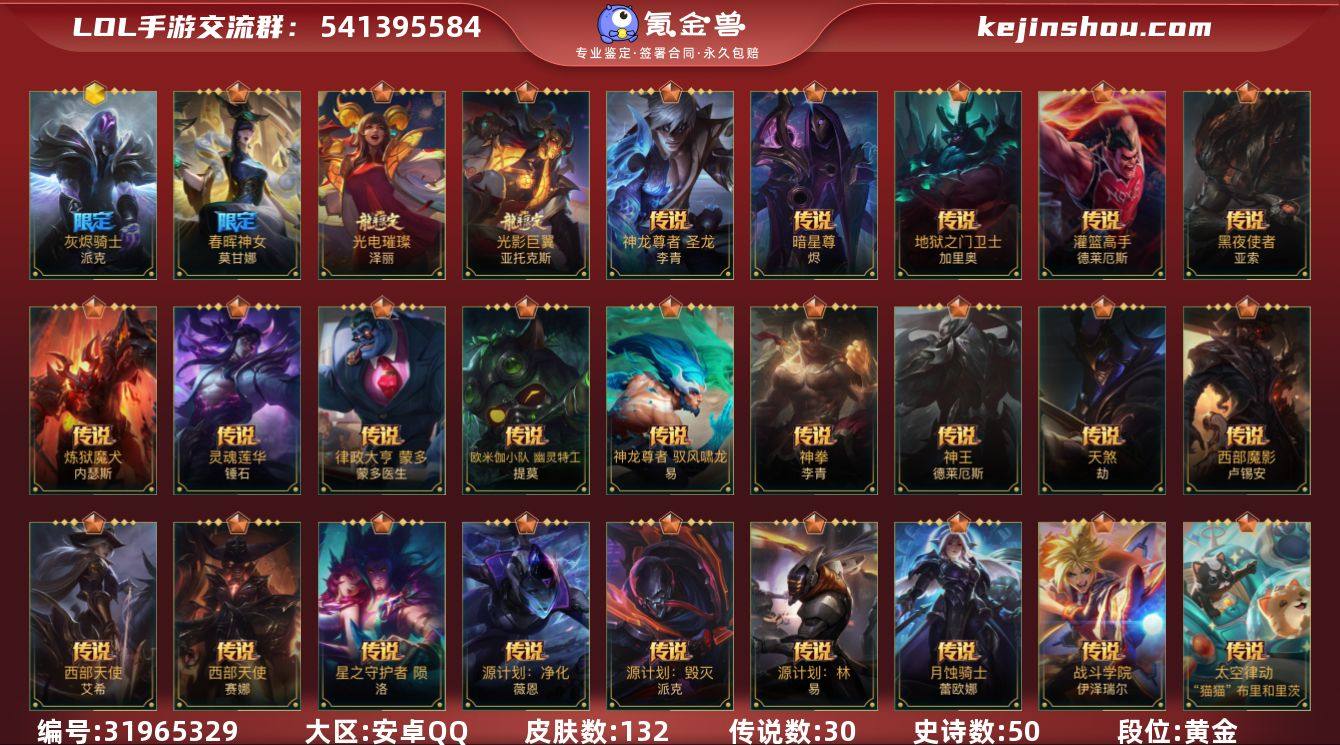 实名: 可修改 段位: 黄金 皮肤数: 132 神话皮: 灰烬骑士派克 传说皮: 暗星尊,地狱之门卫士,灌篮高手,黑夜使者亚索,炼狱魔犬,律政大亨,欧米伽小队 幽灵特工,神龙尊者 驭风啸龙,神拳盲僧,神王诺手,天煞劫,西部魔影卢锡安,西部天使寒冰,西部天使赛娜,星之守护者 陨,源计划:净化,月蚀骑士蕾欧娜,战斗学院ez,灵魂莲华锤石,源计划:林,太空律动机器人,斗魂无双亚索,灵魂莲华腕豪,心之钢凯隐,源计划:毁灭,春晖神女莫甘娜,光影巨翼亚托克斯,光电璀璨泽丽,斗魂觉醒 莎弥拉,神龙尊者 圣龙 李青 亮点: 【优质装备】:暗星尊,灌篮高手,黑夜使者亚索,炼狱魔犬,律政大亨,欧米伽小队 幽灵特工,神龙尊者 驭风啸龙,神拳盲僧,神王诺手,天煞劫,西部魔影卢锡安,西部天使寒冰,西部天使赛娜,星之守护者 陨,源计划:净化,月蚀骑士蕾欧娜,战斗学院ez,灵魂莲华锤石,源计划:林,灰烬骑士派克,灵魂莲华腕豪,心之钢凯隐,斗魂觉醒 莎弥拉