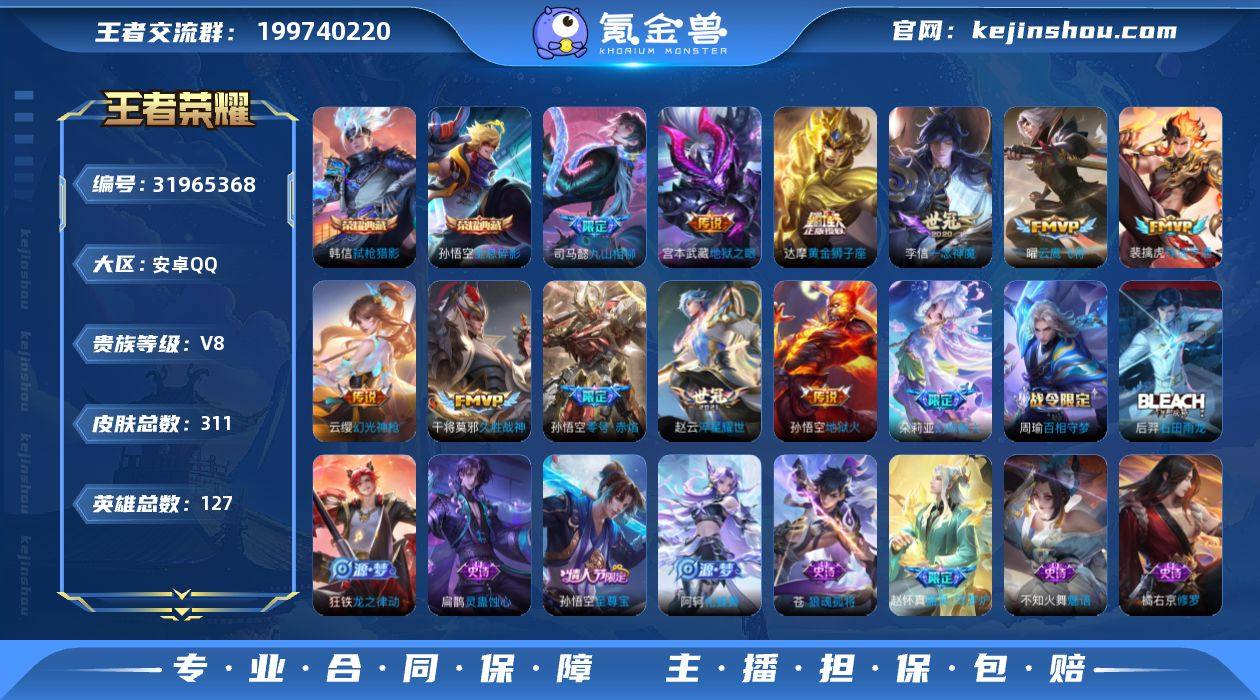 V8 2典藏 19传说 127英雄 311皮肤 可修改实名 女号 【英雄全皮】敖隐全皮,空空儿全皮,孙权全皮,蚩奼全皮,苍全皮,达摩全皮,鬼谷子全皮,司马懿全皮,影全皮,大禹全皮 【稀有英雄】敖隐(小龙人),大司命,韩信(韩跳跳),夏洛特(夏师傅),艾琳,橘右京(橘子),娜可露露(鸟人),不知火舞,赵云,金蝉(唐僧),戈娅 【荣耀水晶】弑枪猎影(韩信典藏),全息碎影(猴子典藏) 【传说皮】典韦战鼓燎原,幻光神枪,神树通天,死亡执政官,九山相柳,祥瑞亨通,黄金狮子座,零号·赤焰,地狱火,地狱之眼,一念神魔,淬星耀世,久胜战神,云鹰飞将(小将军),时之恋人-刘备(电焊工) 【珍宝阁皮】妄想食味,胡桃夹子,玩趣恶龙 【赛季/战令皮】噬灭天穹(s37),古海寻踪(s33),星界游侠,海盐诗旅(s30),擒涛扼浪(s31),探海日志(s32),剑破天穹(s35),天穹祈灯(s34),天穹之誓(s36),暖冬·兔眠,混沌棋(s18),疑决卦(s19),醍醐杖(s20),原初探秘者(s21),万华元夜(s22),演武夺筹(s23),驱傩正仪(s24),千军破阵(s25),西部大镖客-猪八戒,暗影游猎(游乐娃子),潮玩骑士王,云间偶戏,星际陆战队-达摩,胡桃异想国,神迹守卫-墨子,航海奇遇记,沙漠行僧(s26),大漠名商(s28),云中旅人(s29) 【史诗皮】赞萌露比,瑰影绮梦,化蝶舞,灵蛊蚀心,龙之律动,石田雨龙,百相守梦-周瑜,幻珠鲛人,百相守梦-黄忠,守夜人,织梦人,糖绘人间,器灵·浮梦炉,茶境仙,百相守梦-百里守约,谪仙醉月,星界特工,炽弈燎原,破空之剑,上官婉儿群星魔术团,蒙犽顽岩魄,怒海争锋,涂山容容,罗小黑战记-百里玄策,线条小狗-周瑜,狼魂孤将,万灵启世,巫礼祀神,紫霞仙子,苍穹之光,电玩小子(小书包),黄金分割率,特工魅影,千年之狐,永昼,百解令(蒙犽),无限星赏官,龙骑士(小龙虾),冰冠公主,偶像歌手,魅语,江河有灵,电玩·爆裂旋风,末日机甲-吕布,猫狗日记-孙策,猫狗日记-大乔,节奏热浪,修罗,女仆咖啡,摇滚巨星,水果甜