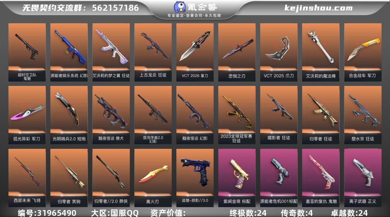 MWW514【11W价值 22冠军套 23冠军套 西部未来套 RGX11zPro//2.0套 创纪元套 苍龙套 盖亚的复仇套 盖亚的复仇2.0套 归零者套 】【游戏等级】Lv68 【段位】 铂金II 【R点】685 【皮肤总价值】113,950 【英雄数量】24 【皮肤数量】95 【挂饰数量】52 【卡面数量】75 【喷漆数量】72 【近战武器】近战武器-天玄刀 近战武器-2022全球冠军赛蝴蝶刀 近战武器-未来开拓者 近战武器-RGX11zPro//2.0蝴蝶刀 近战武器-奇点//2.0蝴蝶刀 近战武器-机动狂飙战刀 近战武器-剥皮小刀 近战武器-镭切 近战武器-紫金爪刀 近战武器-荒土机兵热能刀 近战武器-天御刀 近战武器-落英飞旋 近战武器-盖亚之愠 近战武器-生物收割器 近战武器-弧光异彩军刀 近战武器-偃月 近战武器-盖亚之怒 近战武器-2023全球冠军赛苦无 【幻影】幻影-2022全球冠军赛 幻影-西部未来 幻影-RGX11zPro//2.0 幻影-神圣领域 幻影-纳米打击 幻影-盖亚的复仇//2.0 幻影-噬源兽防卫工程 幻影-侦察力量 【飞将】飞将-西部未来 飞将-天界神兵 飞将-信手涂鸦 飞将-盖亚的复仇 【奥丁】奥丁-西部未来 奥丁-纳米打击 奥丁-信手涂鸦 【正义】正义-西部未来 正义-月球哨兵 正义-创·纪元 正义-纳米打击 正义-掠影 正义-偃月苍龙 【獠犬】獠犬-神圣领域 獠犬-逆冲蛮牛 獠犬-归零者 獠犬-弧光异彩 【莽侠】莽侠-月球哨兵 莽侠-创·纪元 莽侠-归零者//2.0 【标配】标配-RGX11zPro//2.0 标配-VCT25xEDG 标配-荒土机兵 标配-VCTxBBL 标配-彩梦之城 【冥驹】冥驹-RGX11zPro//2.0 冥驹-掠影 冥驹-离子武器 冥驹-荒土机兵 冥驹-归零者 冥驹-偃月苍龙 【骇灵】骇灵-RGX11zPro//2.0 骇灵-星云暗涌 骇灵-创·纪元 骇灵-堕天遗武 骇灵-荒土机兵 骇灵-信手涂鸦 【雄鹿】雄鹿-月球哨兵 雄鹿-逆冲蛮牛 雄鹿-盖亚的复仇//2.0 雄鹿-彩梦之