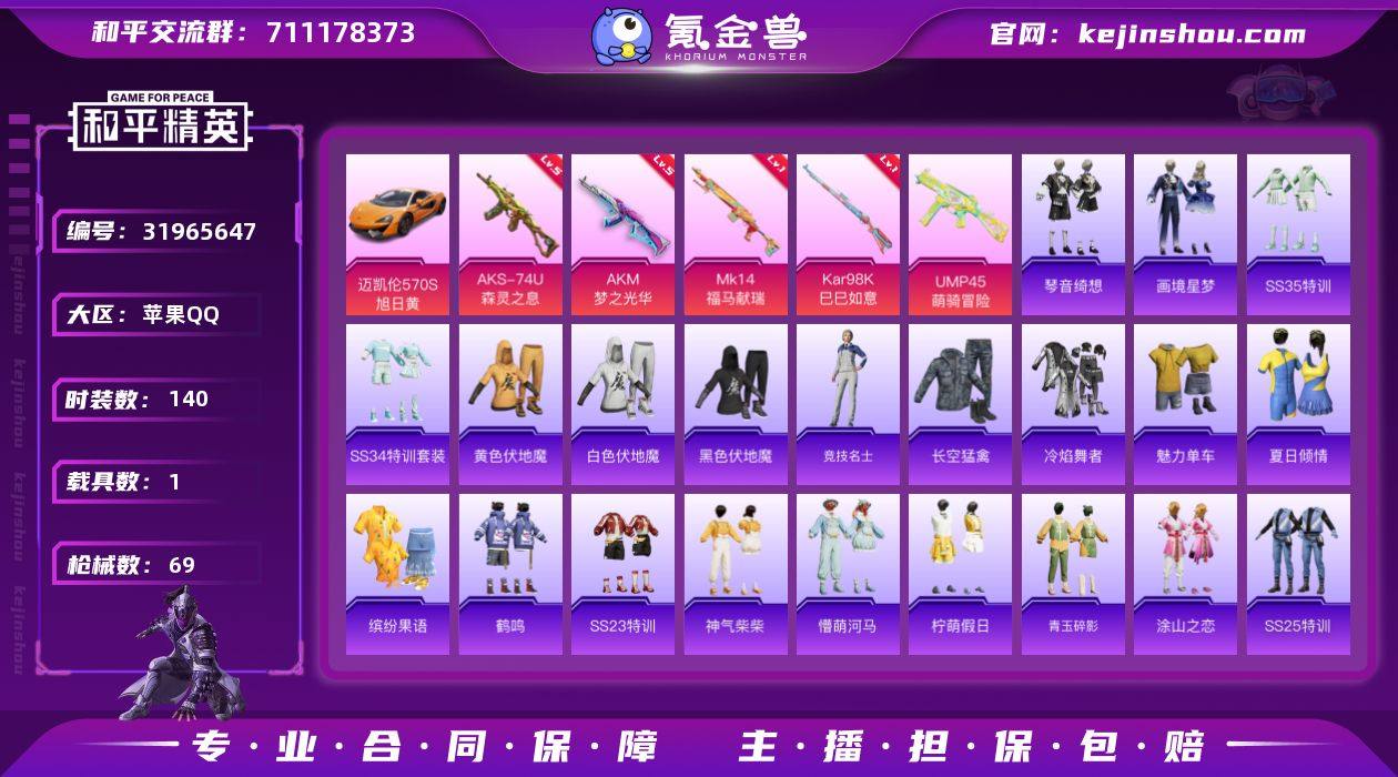 实名: 可修改 时装数: 140 载具数: 1 枪械数: 69 战备数: 1 载具: 迈凯伦570S(旭日黄) 稀有枪皮: AKM梦之光华,Kar98K-巳巳如意,AKS-74U-森灵之息,MK14-福马献瑞,UMP45-萌骑冒险