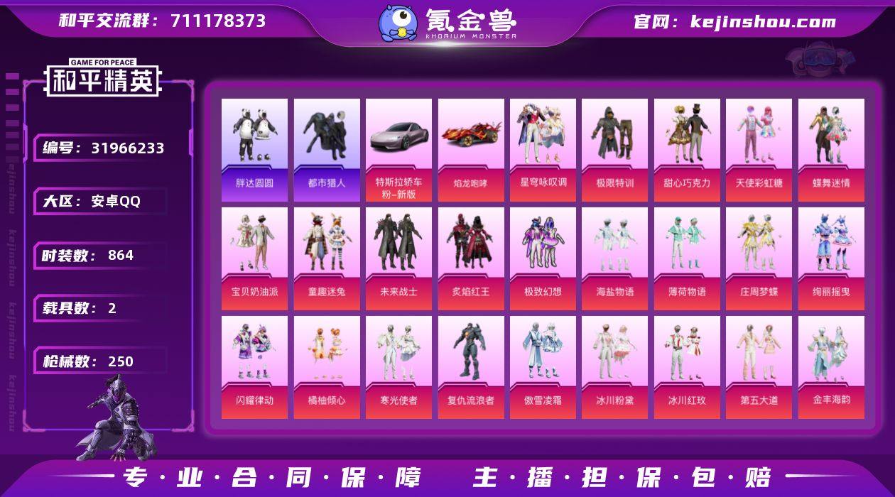 【ky73】安卓 手Q-1神装-12粉装-11特效枪-4载具-7粉色飞行器-100298热力值-10王牌印记-230套装-286枪皮 【红色神装等级】:灵猫魔法师-塞维尔(三级) 【红色角色神装】:灵猫魔法师-塞维尔 【热门品类】:粉装-梦幻火箭,套装-龟仙人,套装-暗影哥特,角色-8号机,角色-Mark.06 【粉色套装】:粉装-梦幻火箭,粉装-PEL轰鸣竞梦者,粉装-彗云及圣,粉装-翡翠骑士,角色-烟云彩露,角色-美琪,角色-初号机 觉醒Ver.,角色-千金淑猫,粉装-百变魔方,角色-荧海星豚,角色-羊梦糖心,角色-异瞳寒姬 【粉色枪皮等级】:SCAR-L-锦绣绵绵(五级),M416-电玩时刻(五级),M416-灵猫魔法师(三级),GROZA-镜光银凌(五级),AUG-暖羊咩咩(五级),UMP45-量子极限(五级),AKS-74U-森灵之息(五级),Kar98K-巳巳如意(五级),AMR-智耀战神(七级),DP-28-豹影疾电(五级),MG-36-沧焰双生(五级) 【粉色载具】:玛莎拉蒂Ghibli(粉),合金龙骨(蓝),星梦玉骢,黑曜夜骑 【粉色枪皮】:SCAR-L-锦绣绵绵,M416-电玩时刻,M416-灵猫魔法师,GROZA-镜光银凌,AUG-暖羊咩咩,UMP45-量子极限,AKS-74U-森灵之息,Kar98K-巳巳如意,AMR-智耀战神,DP-28-豹影疾电,MG-36-沧焰双生 【粉色飞行器】:梦幻火箭飞行器,镜光幻境飞行翼,冠军兔兔飞行器,BEARBRICK飞行器,圣域金龙飞行器,灵猫魔法师飞行器,暮色之舞飞行器 【粉色降落伞】:百万伏特降落伞,至尊龙雀降落伞,精灵迷巫降落伞,梦幻火箭降落伞,炫紫旋律降落伞,神秘黑猫降落伞,古堡领主降落伞,心之恋语降落伞,千面幻镜降落伞,江南烟雨降落伞,精灵梦叶罗丽降落伞,千金淑猫降落伞,彩虹独角兽降落伞,雪月幻音降落伞,绯果甜心降落伞,星穹咏叹调降落伞,荧海星豚降落伞,灵猫魔法师降落伞,无垠阁降落伞,异瞳寒姬降落伞 【稀有套装】:套装-龟仙人,套装-巳巳如意,套装-雏...