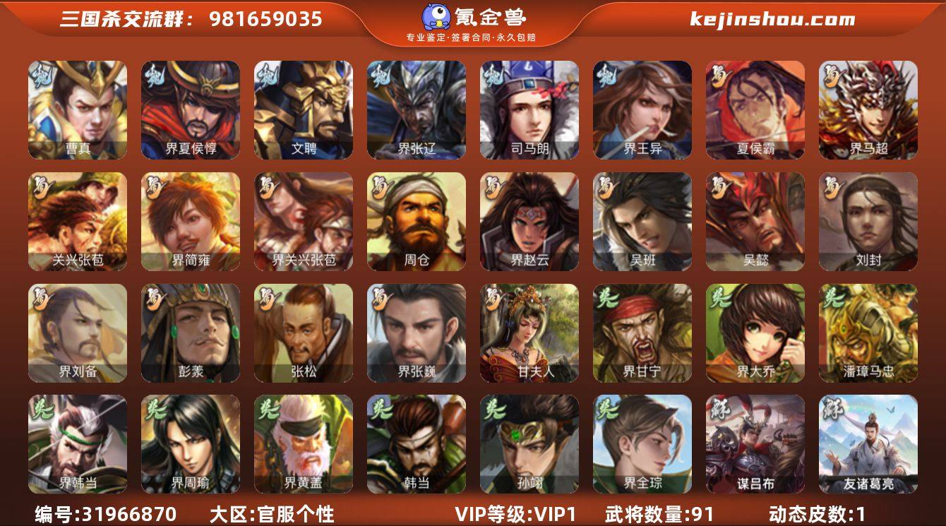 sgss编号188 友诸葛 谋吕布 5000将魂开局号 官方个性账号官阶:先锋将军;VIP等级:VIP1;史诗武将数量:2;动态皮肤数量:1;武将总数:91;史诗宝珠数量:0;将魂数量:5355;神将:0;魏国史诗武将:2;蜀国史诗武将:0;吴国史诗武将:0;群史诗武将:2 谋吕布,友诸葛亮,文聘,界王异,界夏侯惇,界张辽,曹真,司马朗,夏侯霸,关兴张苞,刘封,界关兴张苞,界刘备,界赵云,界马超,吴懿,周仓,张松,界简雍,彭羕,界张嶷,吴班,甘夫人,韩当,潘璋马忠,界甘宁,界黄盖,界周瑜,界大乔,界韩当,孙翊,界全琮,伏完,界袁术,华雄,袁术,界华佗,公孙瓒,界貂蝉,谋高顺,张昌蒲-龙年端午(动态)