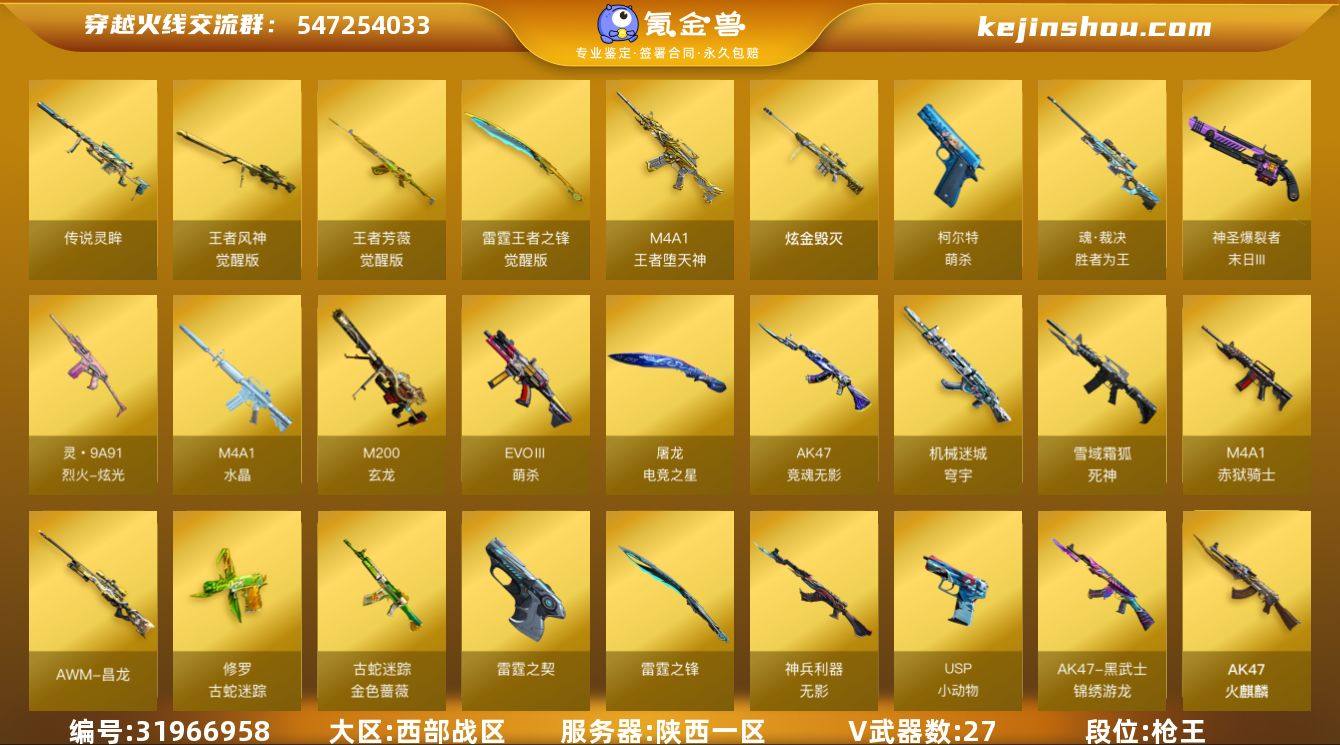 实名:不可二次实名 段位:枪王 VIP等级:VIP6 V武器数:27 王者武器数:4 CF点:6322 传说灵眸 AK47-竞魂无影,EVOⅢ-萌杀,魂·裁决-胜者为王,柯尔特-萌杀,灵・9A91-烈火-炫光,M200-玄龙,M4A1-水晶,M4A1-再燃火线,神圣爆裂者-末日III,屠龙-电竞之星,机械迷城-穹宇,死神-雪域霜狐,M4A1-赤狱骑士,AWM-昌龙,修罗-古蛇迷踪,金色蔷薇-古蛇迷踪,雷霆之契,雷霆之锋,无影-神兵利器,USP-小动物,AK47-黑武士-锦绣游龙,AK47-火麒麟,M4A1-雷神,M4A1-青龙,M200-幻神,Barrett-毁灭,Kar98k-星神,AN94-超新星,USP-雷暴,斩神刀-雷暴,幻灵之锋,裁决,柯尔特-冠军之特,龙啸-烈火龙威,烈火-动感闪耀,天神-动感闪耀,屠龙-动感闪耀,擎天-云海游龙 王者风神-觉醒版,王者芳薇-觉醒版,雷霆王者之锋-觉醒版,M4A1-王者堕天神 屠龙-电竞之星-竞星跃动音效卡,死神-雪域霜狐-怀旧音效卡,云海游龙音效卡,天神动感闪耀音效卡 炫金毁灭 羊驼玩偶,魔能飞环-曼陀罗,Mini沃特X,迷你白狐,HK417-朱雀-蛇隐宗,牛牛-AK47,猫猫手套 卖家说:双幻神+传说灵眸幻神+星神带音效卡+3个英雄手枪+2个4防角色