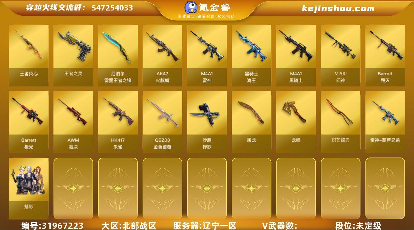 实名: 不可修改 排位资格: 有 V武器: AK47-火麒麟,M4A1-雷神,M4A1-黑骑士,Barrett-毁灭,Barrett-极光,AWM-裁决,M200-幻神,HK417-朱雀,QBZ03-金色蔷薇,沙鹰-修罗,屠龙,龙啸,黑骑士-海王,雷神-葫芦兄弟,炽芒蝶刃,龙啸-烈火龙威,擎天-云海游龙,AK47-黑武士-锦绣游龙,烈龙-云海游龙,马来剑-夜魔,机械迷城-穹宇,AK47-竞魂无影,金色蔷薇-狼王,M4A1-狼王,萨维奇-热血派对,XM1014-神猪元帅,魂·裁决-胜者为王,Colt1911-胜者为王,M4A1-水晶 王者武器: 王者炎心,王者之灵,雷霆王者之锋,王者冰魄-觉醒版,COP 357-雷霆王者-觉醒版,M4A1-雷霆王者-觉醒版 狙击枪稀有皮肤: 毁灭-黑大圣皮肤 英雄角色: 魅影 音效道具: Barrett-毁灭音效卡