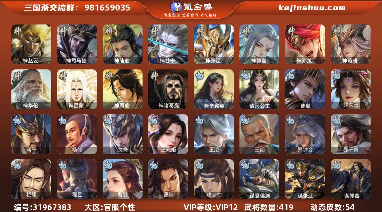 【4038】官阶:大将军;VIP等级:VIP12;史诗武将数量:67;动态皮肤数量:54;武将总数:419;史诗宝珠数量:78;将魂数量:7619;神将:10;魏国史诗武将:36;蜀国史诗武将:11;吴国史诗武将:13;群史诗武将:20/神诸葛亮/神赵云/神司马懿/神陆逊/神甘宁/神张辽/神郭嘉/神孙策/神荀彧/神华佗/势辛宪英/王凌/界于禁/界钟会/嵇康/程昱/戏志才/杨修/曹婴/王朗/王元姬/郭女王/蒋干/清河公主/曹髦/曹纯/谋诸葛亮/谋马超/谋赵云/谋关羽/花鬘/马云騄/张星彩/关索/沙摩柯/周群/谯周/文鸯/势太史慈/势陆郁生/骆统/周处/界徐盛/界步练师/贺齐/孙皓/留赞/孙寒华/张奋/司马昭/左慈/许攸/谋张角/杜预/界左慈/沮授/界李儒/张让/陶谦/刘焉/苏飞/张琪瑛/兀突骨/杨彪/十常侍/星甘宁/星黄忠/星董卓/蒯越蒯良/王基/毌丘俭/势夏侯尚/谋甄姬/谋荀彧/谋郭嘉/谋夏侯渊/谋张辽/卞夫人/辛毗/华歆/蔡贞姬/袁涣/王双/崔琰/界曹操/界司马懿/界夏侯惇/界张辽/界许褚/界郭嘉/界夏侯渊/界典韦/界荀彧/界徐晃/界曹丕/界邓艾/张春华/钟会/曹冲/郭淮/满宠/曹真/韩浩史涣/陈群/曹叡/曹休/钟繇/界曹植/界王异/界满宠/界郭淮/界陈群/界曹休/郭皇后/孙资刘放/辛宪英/诸葛诞/曹昂/SP关羽/SP姜维/文聘/乐进/司马朗/SP蔡文姬/SP...