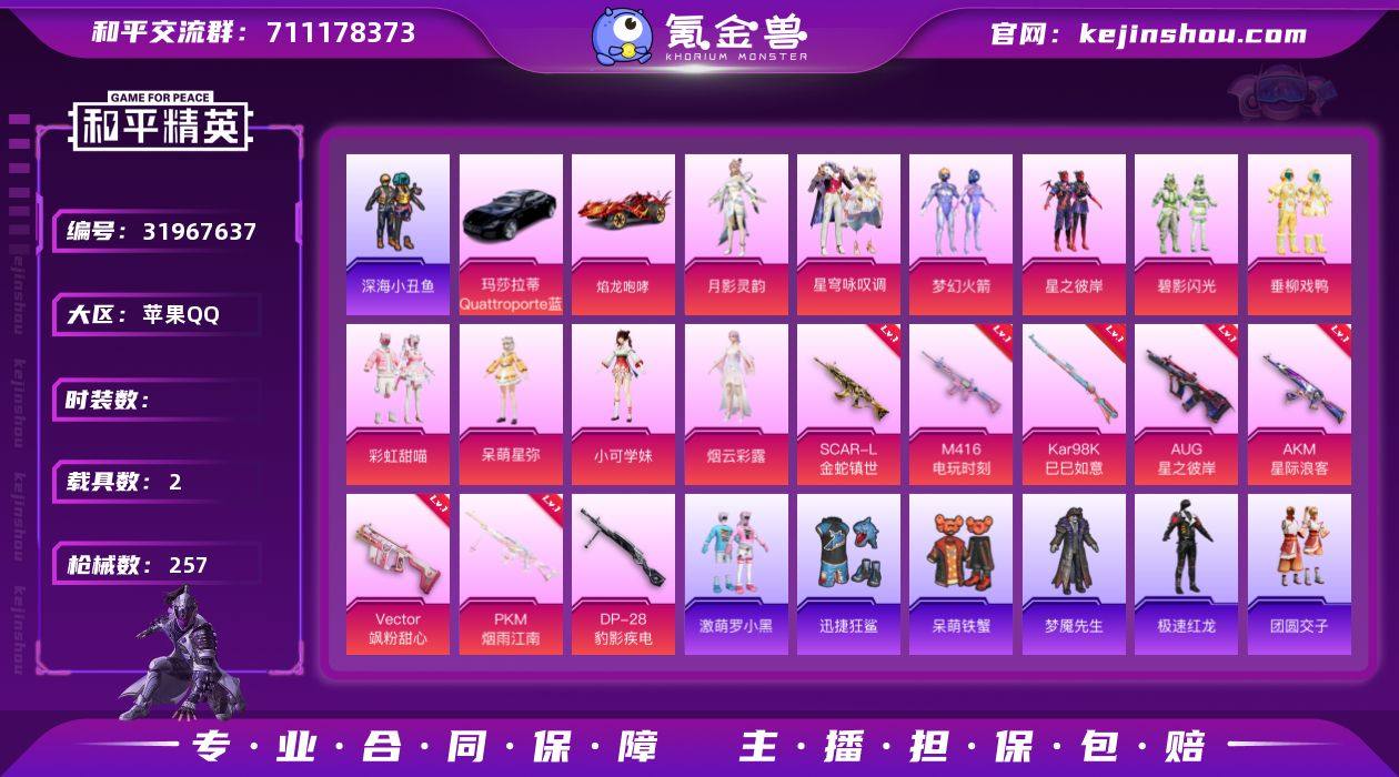 【ky596】苹果 手Q-9粉装-7特效枪-1载具-1粉色飞行器-86827热力值-16王牌印记-240套装-269枪皮 【热门品类】:粉装-缤纷油彩,套装-浪漫天命,套装-小丑鱼,套装-金羽特工,套装-龟仙人,套装-潮萌小黄鸭,套装-粉红小猪 【粉色套装】:粉装-天使彩虹糖,粉装-缤纷油彩,粉装-俏皮狐尾,粉装-星之彼岸,角色-洛天依,粉装-纯珍童话,角色-呆萌星弥,角色-小可学妹,角色-电磁星 【粉色枪皮等级】:AKM-炫紫旋律(七级),SCAR-L-青春物语(七级),M416-电玩时刻(五级),GROZA-巴啦啦小魔仙(七级),UMP45-萌骑冒险(二级),Kar98K-巳巳如意(五级),DP-28-豹影疾电(五级) 【粉色载具】:特斯拉Roadster(水滴蓝) 【粉色枪皮】:AKM-炫紫旋律,SCAR-L-青春物语,M416-电玩时刻,GROZA-巴啦啦小魔仙,UMP45-萌骑冒险,Kar98K-巳巳如意,DP-28-豹影疾电 【粉色飞行器】:阿狸红飞行器 【粉色降落伞】:粉色回忆降落伞,甜心宝贝降落伞,华贵君王降落伞,神秘黑猫降落伞,阿狸红降落伞,暗夜玫瑰降落伞,仲夏莫吉托降落伞,白勺歌姬降落伞,江南烟雨降落伞,忍者神龟降落伞,虹云熊熊降落伞 【稀有套装】:套装-龟仙人,套装-雪国风尚,套装-糖糖葫芦,套装-青团波波,角色-临安公主,套装-燕燕于飞,套装-鱼渊荷华,套装-旋风灵鼠 【稀有枪皮】:AKM-夜灯,AKM-彩虹符号,AKM-恐龙拽拽,AKM-灼热熔岩,AKM-萌趣颜团子,AKM-阿狸红,AKM-霓虹街区,M16A4-夜灯,M16A4-幻世战舞者,M16A4-甜心亚梦,M16A4-生命誓言,M16A4-红色方程式,M16A4-蓝色火焰,SCAR-L-炫彩节奏,SCAR-L-玉兔迎春,SCAR-L-红色方程式,SCAR-L-金风玉露,M416-夜灯,M416-神秘黑猫,M416-糯团青竹,M416-红色方程式,M416-绯红前夜,M416-蓝色火焰,M416-魔法学院,GROZA-彩虹符号,GROZA-影袭,GROZA-懵萌河马,GROZA-治愈之星,GROZA-田园牧歌,GROZ...