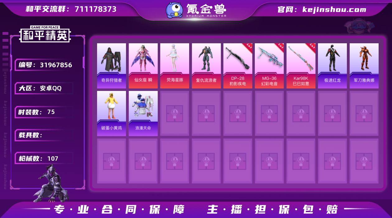 DSH2110【身法号 4特 4粉奇异狩猎者,浪漫天命】安卓Q-3稀有4粉装4特效枪4热门75套装107枪皮 32144热力值 4印记 历史传奇王牌17星 【3稀有】 奇异狩猎者 AKM-缤纷海域 浪漫天命 【4粉装】 仙女座瞬 荧海星豚 异瞳寒姬 复仇流浪者 【4特效枪】 Kar98K-巳巳如意 (4级) MG-36-幻彩电音 (6级) DP-28-豹影疾电 (5级) 蜜獾-异瞳寒姬 (5级) 【4热门】 破蛋小黄鸡 极速红龙 军刀雅典娜 英勇保护者 【2飞行器】 梦幻火箭飞行器 闪光银龙飞行器 【1头盔】 深海小丑鱼头盔 【1背包】 幻影战神背包 营地ID:917494403