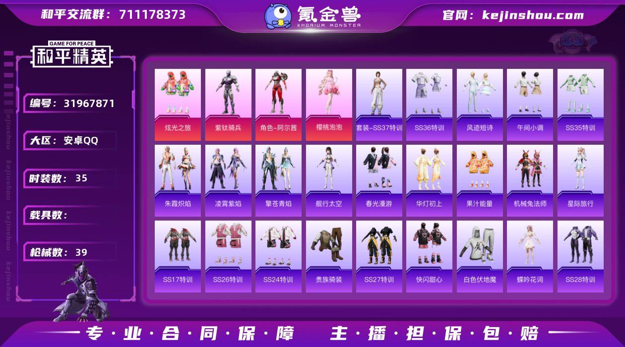 【和平精英】4粉装,4特效枪,0载具,历史最高段位:卓越王牌6星 王牌印记2次 热力值:28803,74套装,98枪械,115装备,59战备;套装:角色-阿尔茜,套装-炫光之旅,角色-紫钛骑兵,角色-樱桃泡泡,套装-猎鹰,套装-青年教官,套装-橘黑制服,套装-红色运动,套装-黄色运动,套装-蓝色运动,套装-黄色伏地魔,套装-白色伏地魔,套装-黑色伏地魔,套装-竞技名士,套装-深蓝色名流,套装-酒红色名流,套装-湖蓝色名流,套装-长空猛禽,套装-灼焰舞者,套装-贵族骑装,套装-完美偶像,套装-坚韧舞者,套装-竞技达人朋克,套装-缤纷果语,套装-极速红龙,套装-疯狂小兔子,套装-白糯汤圆,套装-机械兔法师,套装-狙击之神,套装-吉莉礼服,套装-SS17特训,套装-霓虹极客,套装-绯格组合,套装-SS24特训,套装-华灯初上,套装-春野茶蘼,套装-摄影小熊猫,套装-SS25特训,套装-金戈铁马,套装-惊鸿侠骨,套装-锦衣飞扬,套装-果汁能量,套装-龙的传人,套装-SS26特训,套装-快闪甜心,套装-春光漫游,套装-空岛之星,角色-星际旅行,角色-舰行太空,套装-云魄琉璃,套装-SS27特训,套装-老实芭蕉,套装-SS28特训,角色-蝶吟花词,套装-海盐绵绵冰,角色-蜜桃派对,角色-糖霜甜心,套装-SS33特训,套装-青翼流星,套装-狂鲨锋刃,套装-蓝海鲸歌,套装-元气之梦,套装-SS34特训,套装-擎苍青焰,套装-朱霞炽焰,套装-凌霄紫焰,套装-薄荷星砂,套装-SS35特训,套装-午间小调,套装-风迹短诗,套装-SS37特训,套装-SS36特训,套装-雪国风尚,套装-福马献瑞;枪皮:AKM-涂鸦街区,AKM-龙的传人,AKM-绿洲时空,蜜獾-天降萌叽,蜜獾-精灵梦叶罗丽,蜜獾-风迹短诗,AUG-天降萌叽,Mk47-炫光之旅,Mk47-风迹短诗,M762-天降萌叽,G36C-乌木金纹,Famas-乌木金纹,5级SCAR-L-锦绣绵绵,SCAR-L-海盐豹豹,GROZA-蓝莓炮弹,GROZA-...