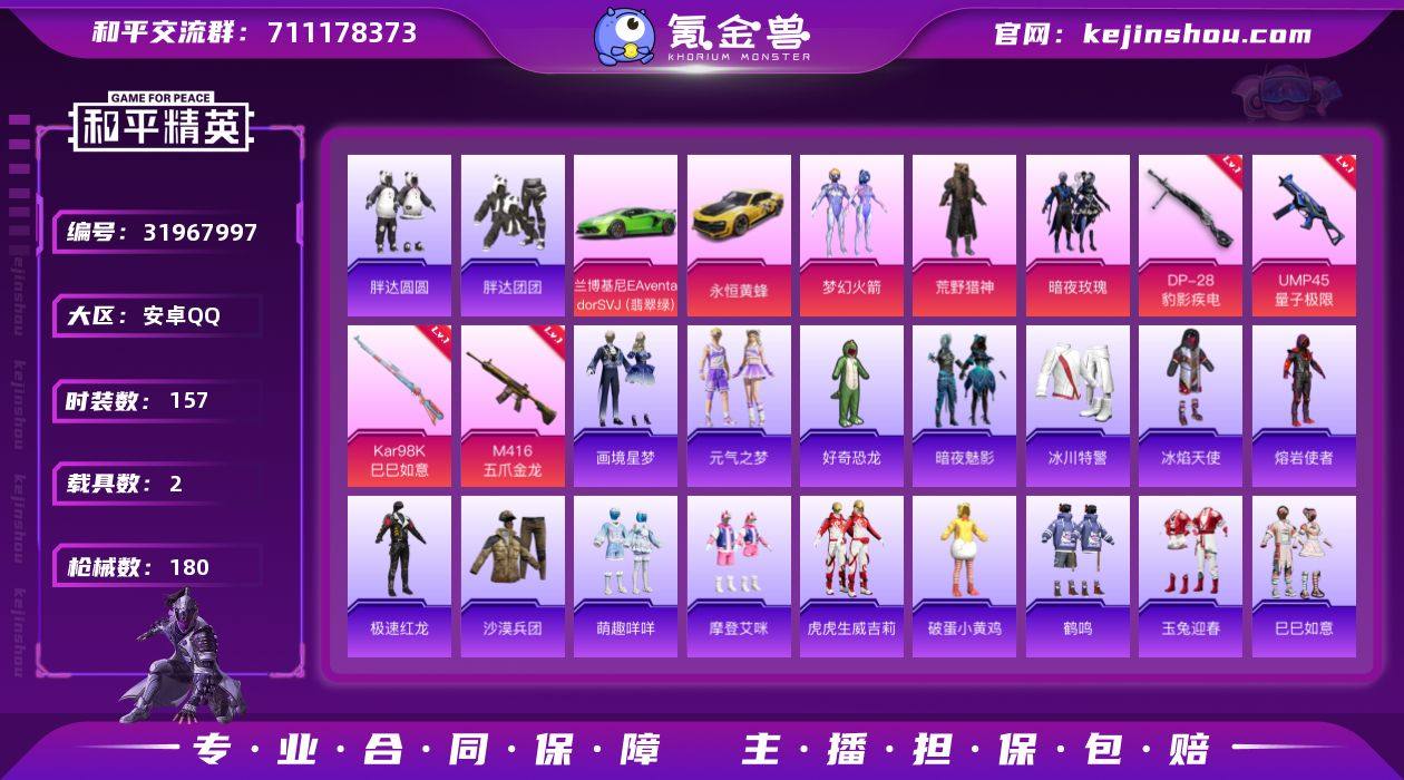 M1046320【身法号3粉装4特效2载具 梦幻火箭 荒野猎神 浪漫天命 胖达团团 时之沙漏 胖达圆圆 7级五爪金龙】安卓手Q-2载具-3粉装-4特效枪-157套装-180枪皮-2王牌印记-不朽星钻Ⅴ-61776热力值【2载具】永恒黄蜂,兰博基尼Aventador SVJ(翡翠绿)【3粉装】梦幻火箭,暗夜玫瑰,荒野猎神【4特效枪】Kar98K-巳巳如意[5级],M416-五爪金龙[7级],UMP45-量子极限[5级],DP-28-豹影疾电[5级]【3稀有】胖达团团,浪漫天命,胖达圆圆【3飞行器】马上有福飞行器,梦幻火箭飞行器,光之冒险尾迹【1头盔】甜心宝贝头盔【2背包】甜心宝贝背包,梦幻火箭背包【327其它衣服和枪皮】坚韧舞者,新侠客行,虎虎生威吉莉,疯狂小兔子,战术大师,冷焰舞者,冰川特警,角色-捷德奥特曼,SS33特训,SS35特训,极速红龙,蓝彩潮人,绯格组合,雪山征服者,空投萌叽,摩登艾咪,SS9特训,角色-情公主,热情海星,耀粉歌者,SS21特训,巳巳如意,SS27特训,角色-海琴烟,书海巡游,瑞龙福将,森林猎手,金鼠迎春,骑行爱好者,黄色格斗者,灰色格斗者,SS20特训,滨海假日,幻羽潜行,福星高照,湖蓝色名流,牛气冲天,幻彩翩翩,探宝勇士,赛博空间,SS18特训,核芯基因,竞技达人朋克,格斗先锋,暗夜魅影,精神漫游,SS17特训,冰川格斗者,特种颜团子,角色-白光莹,热血青春,锦衣飞扬,蓝色守护者,SS5特训,焰鹰斗篷,北国孤狼,海盐绵绵冰,竞技名士,SS23特训,人气偶像,SS7特训,长空猛禽,SS36特训,深蓝色名流,深蓝冒险家,娇憨猪猪,传奇侦探,音速流光,SS34特训,魅力单车,妙红点点,极乐追光,萌趣颜团子,夏日音浪,醒狮腾龙,幻世猎手,萌趣咩咩,极地朋克,黄色伏地魔,龙的传人,幻影武者,神秘领域,野性战心,时之沙漏,SS19特训,SS6特训,炫蓝之夏,水晶王族,惊鸿侠骨,画境星梦,霓虹街区,奇趣企鹅,SS22特训,猛禽,竞技勇士朋克,光之冒险,元气之梦,冰焰天使,霓虹极客,SS24特训,王牌教练,SS28特训,千禧之恋,粉红