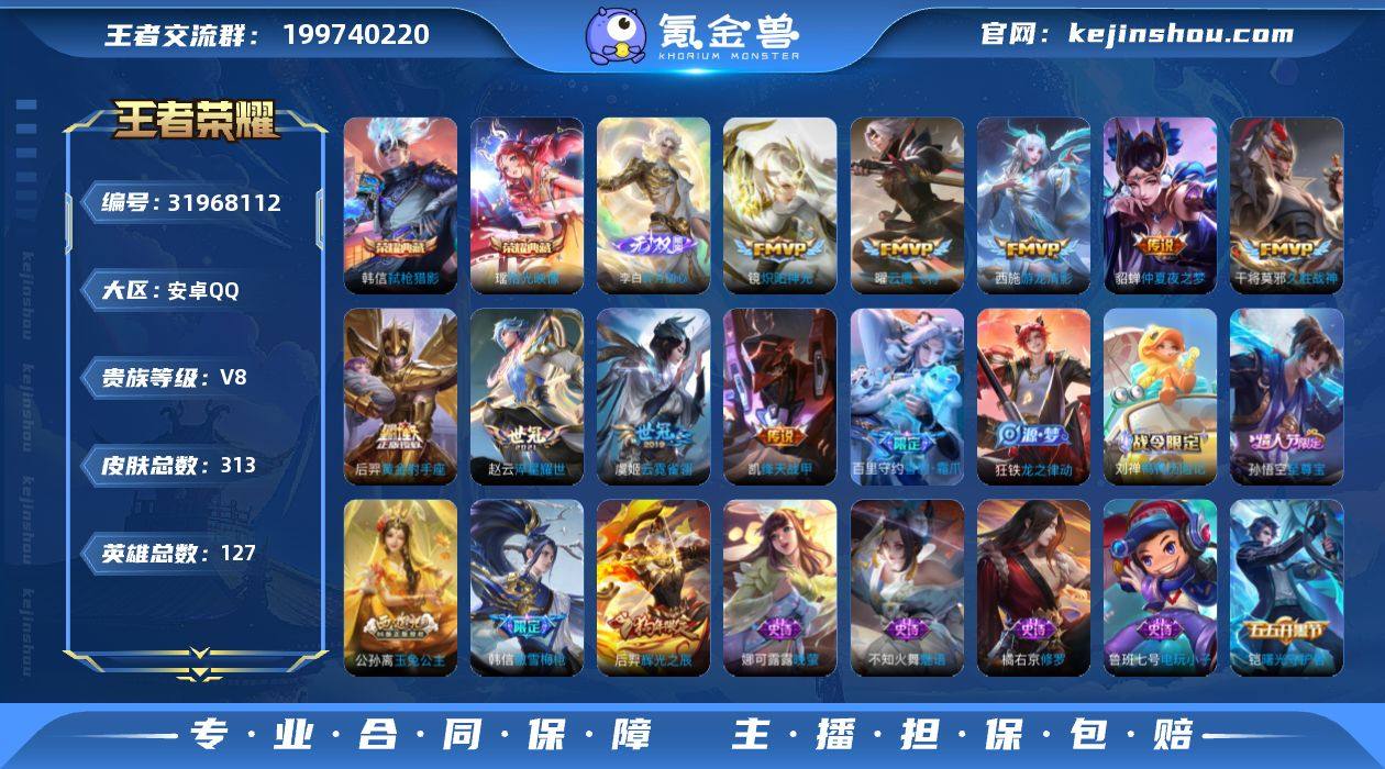 V8 2典藏 1无双 1珍品传说 13传说 127英雄 313皮肤 可修改实名 男号 【英雄全皮】敖隐全皮,孙权全皮,刘禅全皮 【稀有英雄】敖隐(小龙人),大司命,嬴政(始皇帝),韩信(韩跳跳),夏洛特(夏师傅),艾琳,橘右京(橘子),娜可露露(鸟人),不知火舞,赵云,金蝉(唐僧),戈娅 【荣耀水晶】拾光映像(瑶典藏),弑枪猎影(韩信典藏) 【无双皮】碎月剑心(李白无双) 【珍品传说】兔狲·蓬尾 【传说皮】游龙清影(小青龙),黄金射手座,仲夏夜之梦(大飞蛾),末日机甲-孙尚香(绿蚂蚱),云霓雀翎,淬星耀世,久胜战神,云鹰飞将(小将军),炽阳神光,绛天战甲(鸡嘴战神) 【珍宝阁皮】万物之道,优雅恋人,蔷薇恋人 【赛季/战令皮】古海寻踪(s33),海盐诗旅(s30),擒涛扼浪(s31),潮玩骑兵,奇幻香踪,探海日志(s32),驭风魔法,玲珑珍味,流音漫舞,顽趣-梦奇,地狱燃心,剑破天穹(s35),天穹祈灯(s34),狰(s8),饕餮(s9),烛龙(s10),重明(s11),穷奇(s12),御狮(s13),御霄(s14),御旌(s15),御銮(s16),朔风刀(s17),混沌棋(s18),疑决卦(s19),醍醐杖(s20),原初探秘者(s21),万华元夜(s22),演武夺筹(s23),驱傩正仪(s24),千军破阵(s25),朔望之晖,西部大镖客-猪八戒,暗影游猎(游乐娃子),星际陆战队-达摩,胡桃异想国,神迹守卫-墨子,航海奇遇记,圣弓游侠,真爱魔法,火炮绅士,沙漠行僧(s26),幻夜卜梦,金庭之子(s27),大漠名商(s28),云中旅人(s29),超时空战士-钟无艳,落雪兰心 【史诗皮】赞萌露比,雪豹·霜爪,鸭鸭历险记-刘禅,龙之律动,守夜人,织梦人,蔬乡物语(鲁班七号),星界战将,星界特工,怒海争锋,上官婉儿群星魔术团,涂山容容,紫霞仙子,电玩小子(小书包),黄金分割率,特工魅影,千年之狐,高渐离燃音魔法,蒙恬荣光圣徽,龙骑士(小龙虾),冰冠公主,青蛇,偶像歌手,晚萤,无限星赏官,魅语,白蛇,江河有灵,电玩·爆裂旋风,末日机甲-吕