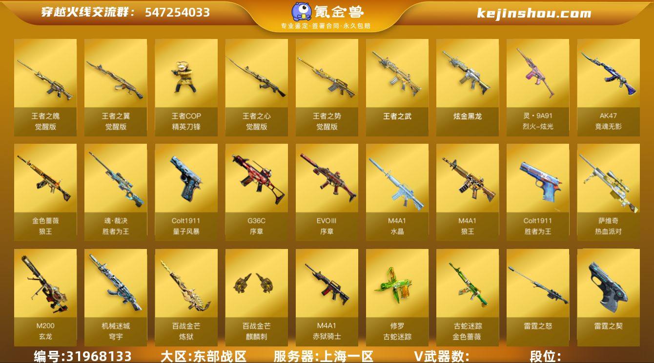 东部战区(上海一区)lb【精品生化爆破号】传说【传说辉光】107v【竞技荣光套装,雷霆套装,古蛇迷踪套装,QBZ03-金色蔷薇+音效卡,ScarLight-白虎+音效卡,AWM-裁决+双皮/叶芒苍灵/星际旅行,6烈龙+死亡之眼,USP-雷暴王者,COP357-雷霆,USP-雷暴,柯尔特-竞技荣光,王者COP-精英刀锋,胡萝卜匕首】6王者【王者之心,王者之翼,王者之魄,王者之势,王者之武,USP-雷暴王者,】1炫金【炫金黑龙】7角色【电竞教官-云悠悠,炫,战地猎狐,蛇隐宗,零·纪元,不败狙神,葵-阿尔法武装】6音效【QBZ03-金色蔷薇音效卡,ScarLight-白虎音效卡,炼狱-百战金芒-庆典舞曲音效卡,黑龙-古蛇迷踪音效卡,Barrett-毁灭音效卡,M4A1-雷神音效卡】25皮【毁灭-HeartShot,裁决-叶芒苍灵,裁决-星际旅行,毁灭-星空,雷神-星空,火麒麟-AG战队,天龙-传奇白鲨,屠龙-彼岸花】【VIP3】 截图展示段位不代表实际段位 如赛季更新等不可抗拒因素发生变化、时限道具不保证所剩时间