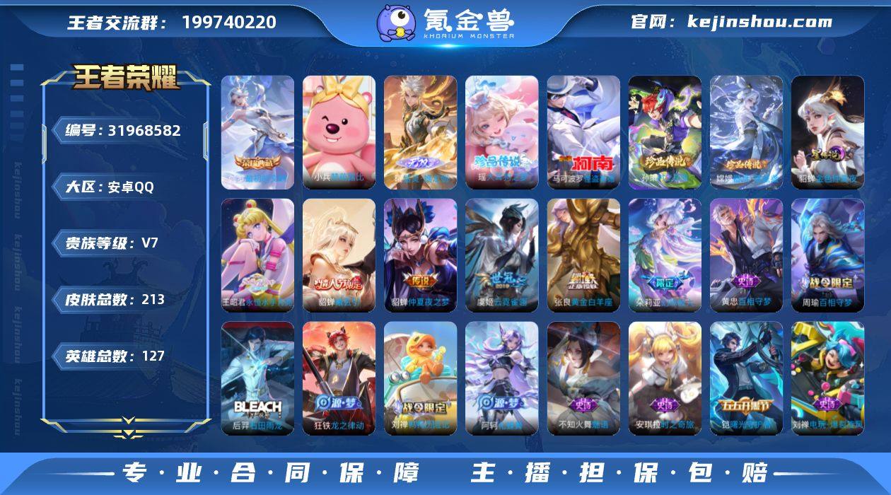 响·器灵螭龙剑·大耳狗之梦·器灵落星盏·孙策时之奇旅·怪盗基德·金色貂蝉·愿照众生和·貂蝉曦玄引·永恒水手月亮·云霓雀翎·寅虎心曲·可二次】w17683-安卓Q-127英雄-213皮肤-5王者印记-210铭文-贵族积分3w【贵族7】【1典藏·1无双·4珍品·1星传说·9传说·16按键】【因赛季更新游戏段付以上号为准!】 【英雄全皮】:刘禅全皮,孙权全皮,敖隐全皮,空空儿全皮 【荣耀典藏】:伽罗最初的交响 【无双皮肤】:曜器灵螭龙剑 【珍品传说】:瑶大耳狗之梦,嫦娥器灵落星盏,孙策时之奇旅,马可波罗怪盗基德 【星元皮肤】:貂蝉金色仲夏夜 【传说皮肤】:后羿神树通天,干将莫邪千山共赴,妲己愿照众生和,桑启鸣野蒿,貂蝉曦玄引,王昭君永恒水手月亮,张良黄金白羊座,虞姬云霓雀翎,貂蝉仲夏夜之梦 【限定皮肤】:蔡文姬夏日便利店,大乔绒语心约,虞姬夏日便利店,姜子牙天穹之誓,狄仁杰阴阳师,赵云皇家上将,孙尚香蔷薇恋人,元歌云间偶戏,元歌无心,狄仁杰魔术师,达摩沙漠行僧,项羽海滩派对,兰陵王金庭之子,李元芳云中旅人,杨玉环寅虎心曲,鬼谷子五谷丰年,沈梦溪大漠名商,明世隐疑决卦,裴擒虎擒涛扼浪,米莱狄胡桃异想国,嫦娥暖冬兔眠,西施玲珑珍味,西施至美乘鲤谣,鲁班大师探海日志,桑启海盐诗旅,暃星界游侠,艾琳流音漫舞,司空震地狱燃心,张良古海寻踪,王昭君永恒水手月亮,蒙犽百解令,高渐离燃音魔法,妲己灵卜魔法,鬼谷子天穹祈灯,姬小满妄想食味,貂蝉曦玄引,沈梦溪龙舞盛年,鲁班七号蔬乡物语,李元芳蔬乡物语,刘邦剑破天穹,程咬金群星魔术团,周瑜熔金海岸 【年限皮肤】:杨玉环寅虎心曲,妲己愿照众生和 【赛季限定】:明世隐疑决卦,达摩沙漠行僧,兰陵王金庭之子,沈梦溪大漠名商,李元芳云中旅人,桑启海盐诗旅,裴擒虎擒涛扼浪,鲁班大师探海日志,张良古海寻踪,鬼谷子天穹祈灯,刘...