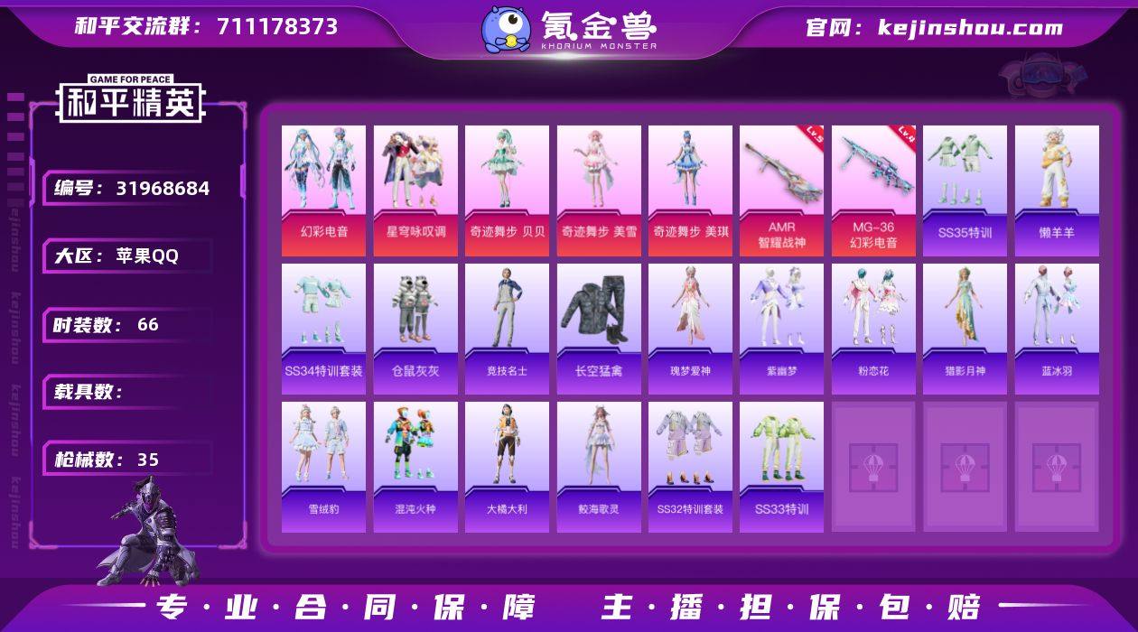 实名: 可修改 时装数: 66 枪械数: 35 热门装扮: 仓鼠灰灰,星穹咏叹调,幻彩电音,奇迹舞步-贝贝,奇迹舞步-美雪,奇迹舞步-美琪 稀有枪皮: AMR-智耀战神,MG-36-幻彩电音