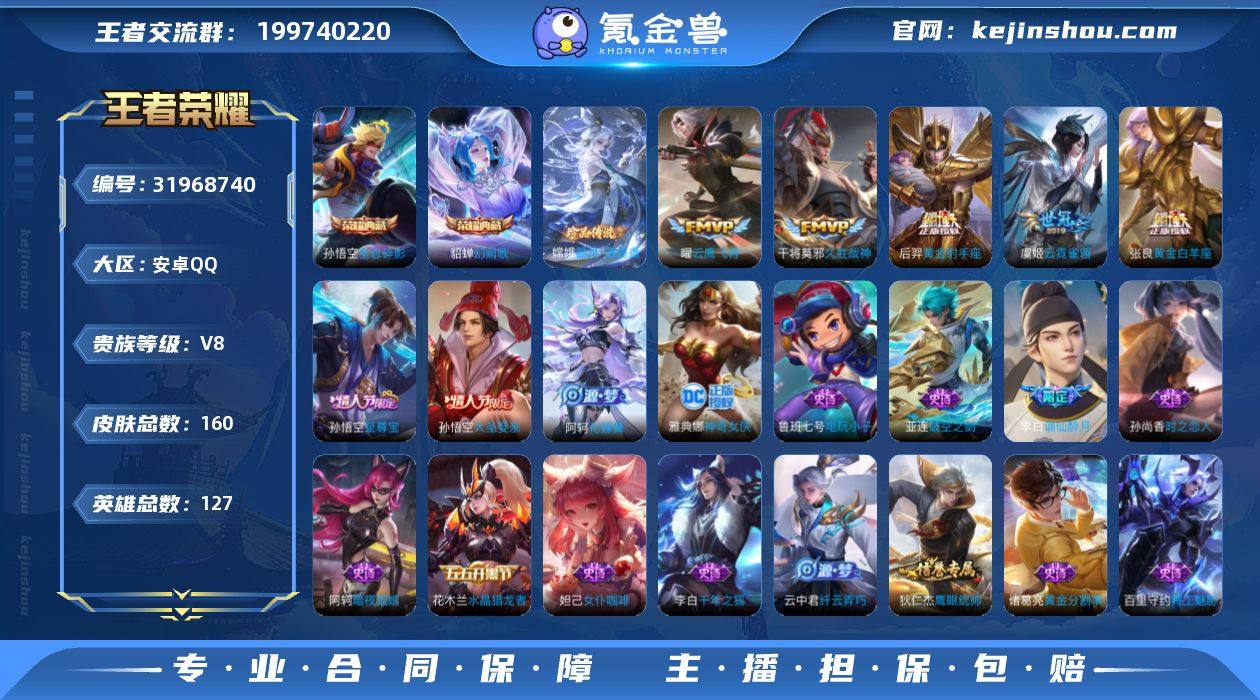 2w金标孙悟空·全息碎影·幻阙歌·器灵落星盏·愿照九州拓·云鹰飞将·久胜战神·启示之音·大圣娶亲·至尊宝·青龙志·可二次】w17686-安卓Q-127英雄-160皮肤-10王者印记-190铭文-贵族积分7w【贵族8】【2典藏·1珍品·9传说·2按键】【因赛季更新游戏段付以上号为准!】 【荣耀典藏】:孙悟空全息碎影,貂蝉幻阙歌 【珍品传说】:嫦娥器灵落星盏 【传说皮肤】:澜愿照九州拓,桑启鸣野蒿,露娜启示之音,虞姬启明星使,曜云鹰飞将,张良黄金白羊座,干将莫邪久胜战神,虞姬云霓雀翎,后羿黄金射手座 【限定皮肤】:姜子牙天穹之誓,李白谪仙醉月,狄仁杰阴阳师,赵云皇家上将,夏侯惇朔风刀,狄仁杰魔术师,狄仁杰万华元夜,项羽海滩派对,老夫子醍醐杖,程咬金演武夺筹,露娜启示之音,孙悟空至尊宝,孙悟空大圣娶亲,牛魔御旌,虞姬启明星使,钟馗驱傩正仪,干将莫邪胡桃夹子,雅典娜单词大作战,鬼谷子原初探秘者,铠青龙志,百里玄策原初追逐者,弈星混沌棋,裴擒虎李小龙,云中君纤云弄巧,蒙犽狂想玩偶喵,鬼谷子天穹祈灯,沈梦溪龙舞盛年,刘邦剑破天穹,程咬金群星魔术团,周瑜熔金海岸 【年限皮肤】:铠青龙志,澜愿照九州拓 【赛季限定】:牛魔御旌,夏侯惇朔风刀,弈星混沌棋,老夫子醍醐杖,鬼谷子原初探秘者,狄仁杰万华元夜,程咬金演武夺筹,钟馗驱傩正仪,鬼谷子天穹祈灯,刘邦剑破天穹,姜子牙天穹之誓,东皇太一噬灭天穹,太乙真人谧流熔炉,钟馗虚灵犬护,甄姬逆浪荇歌,百里玄策原初追逐者,牛魔星界战将,项羽九幽镇关 【战令限定】:蒙犽狂想玩偶喵,雅典娜单词大作战,亚连破空之剑,孙悟空神迹守卫,周瑜线条小狗 【史诗皮肤】:周瑜线条小狗,项羽九幽镇关,阿轲化蝶舞,牛魔星界战将,李白谪仙醉月,亚连破空之剑,云中君纤云弄巧,裴擒虎李小龙,百里玄策原初追逐者,蒙犽狂想玩偶喵,孙尚香时之恋人...