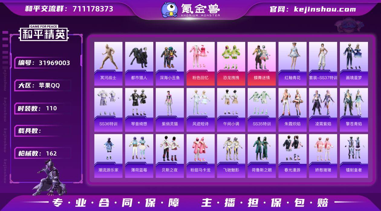 连体王者大国服孙尚香 【特价出售/店主推荐】苹果 手Q-无敌战神框-4粉装-2特效枪-1载具-2粉色飞行器-1.8w热力值-1王牌印记-39套装-34枪皮 【热门品类】:粉装-梦幻火箭,套装-金羽特工,套装-潮萌小黄鸭 【粉色套装】:粉装-梦幻火箭,粉装-华贵君王,粉装-天启纪元,粉装-星之信仰 【粉色枪皮等级】:SCAR-L-梦幻火箭(三级),M24-星之信仰(六级) 【粉色载具】:双人摩托-梦幻火箭 【粉色枪皮】:SCAR-L-梦幻火箭,M24-星之信仰 【粉色飞行器】:梦幻火箭飞行器 【粉色降落伞】:春暖花开降落伞,梦幻火箭降落伞,华贵君王降落伞,天启纪元降落伞,星之信仰降落伞 【稀有枪皮】:AKM-天启纪元,AKM-星之信仰,AKM-破晓战魂,M16A4-九霄,M416-仓鼠灰灰,GROZA-春暖花开,GROZA-暗夜武装,GROZA-黑色刀锋,QBZ-诡娃娃,M762-拳皇97,M762-潮萌小黄鸭,UMP45-天启纪元,UMP45-诡娃娃,Vector-黑色刀锋,Kar98K-华贵君王,Kar98K-梦幻火箭,VSS-华贵君王,VSS-黑色刀锋,Mini14-梦幻火箭,S686-冰封烈焰,S1897-天启纪元,S1897-星之信仰,S12K-九霄,S12K-华贵君王,P92-拳皇97 【其他套装】:套装-SS7特训,套装-SS8特训,套装-丛林猎人,套装-传奇侦探,套装-北国孤狼,套装-奇迹天团,套装-战地英姿,套装-星光纪元,套装-格斗专家,套装-灰色格斗者,套装-灼焰舞者,套装-炽焰拳师,套装-燃烧卡路里,套装-特战装甲,套装-破晓战魂,套装-竞技勇士朋克,套装-耀眼新星,套装-蓝彩潮人,套装-超能勇士,套装-风行保卫者,套装-骑行爱好者,套装-特战英豪,套装-淡雅花蕊,套装-暗夜武装,套装-核芯基因,套装-精神漫游,套装-黑色刀锋,套装-威严将相,套装-圣殿骑士,套装-五号元素,套装-九霄,套装-银河圣歌,套装-闪耀星光,套装-潮萌小黄鸭 【稀有头盔】:九霄头盔(2级),九霄头盔(1级),梦幻火箭头盔(3级)...