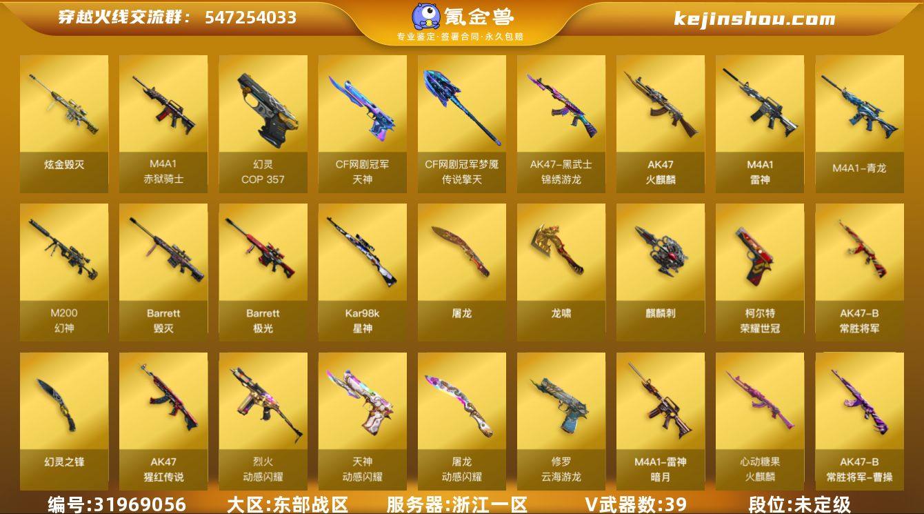 浙江一区-42V-15王者-1炫金 【热门武器】:M4A1-青龙,M200-幻神,荣耀世冠-柯尔特*2,Kar98K-星神,COP 357-幻灵,黄金猫猫手套-白鲨,金刚伞 【王者炫金武器】:炫金毁灭 【音效卡】:M200-幻神音效卡,Barrett-极光音效卡 【皮肤】:幻神-冠军之幻,幻神-宠儿-2021MVP,M200-幻神-荣耀世冠白鲨,雷神-暗月,雷神-动感闪耀 皮肤,M4A1-雷神-巅峰荣耀皮肤,火麒麟-心动糖果,毁灭-冠军之怒,AK47-B-常胜将军-曹操*2,AK47-B-常胜将军-刘备,屠龙-荣耀世冠AG,龙啸-冠军之啸,麒麟刺-甜蜜糖果 皮肤 【角色】:零,炫,隼,王者玲珑,乔伊教练,云海玲珑,暗夜-X,风暴女,嘉年华灵狐,麻雀,斯沃特-X,游珑儿 【人偶武器】:AWM-灵狐-15周年嘉年华,闪光弹-小乔,闪光弹-貂蝉,高爆手雷-大乔 【英雄级武器】:AK47-火麒麟,M4A1-雷神,M4A1-青龙,黑武士-锦绣游龙,烈火-动感闪耀,AK-47-猩红传说,AK47-B-常胜将军,QBZ-03-王者蔷薇-觉醒版,黑武士-CF网剧冠军,Barrett-毁灭,Barrett-极光,M200-幻神,Kar98K-星神,王者幻神-觉醒版,王者风神-觉醒版,COP 357-幻灵,荣耀世冠-柯尔特*2,天神-动感闪耀,修罗-云海游龙,天神-CF网剧冠军,屠龙*3,龙啸,麒麟刺,幻灵之锋*3,屠龙-动感闪耀,擎天-CF网剧冠军,高爆手雷-幻灵*2,手雷-动感闪耀,闪光弹-幻灵*2,闪光弹-雷霆王者-觉醒版*2,烟雾弹-幻灵*3,烟雾弹-雷霆王者-觉醒版,M4A1-赤狱骑士 【道具】:AG战队炫彩背包,EP战队炫彩背包,炫彩背包,超级背包,哔哩哔哩名片,绿色巨人,灵魂忍者,迷雾幽灵,夺命之镰,防化服*2,金色流光-枪王排位*2,星辰流光-枪王排位,枪王排位28赛季金色流光,动感闪耀表情,防弹头盔*2,防弹衣*2,C4工具钳*2,手雷包*2 【特殊枪械】: