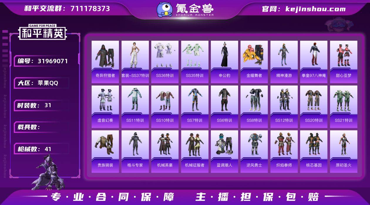 【和平精英】0粉装,1特效枪,1载具,历史最高段位:卓越王牌8星 王牌印记1次 热力值:21986,58套装,82枪械,67装备,37战备;套装:套装-白色伏地魔,套装-黑色伏地魔,套装-竞技名士,套装-黄色名流,套装-伏击者,套装-长空猛禽,套装-竞技勇士朋克,套装-冷焰舞者,套装-贵族骑装,套装-甜蜜告白,套装-沙漠毒蛇,套装-幻影武者,套装-街头潮人,套装-丛林猎人,套装-雪山精英,套装-传奇侦探,套装-奇异狩猎者,套装-金耀舞者,套装-蓝调潮人,套装-缤纷果语,套装-冰川特警,套装-破蛋小黄鸡,套装-疯狂小兔子,套装-机械英豪,套装-机械征服者,套装-SS5特训,套装-圣诞大吉,套装-北国孤狼,套装-SS6特训,套装-拳皇97八神庵,套装-炽焰拳师,套装-格斗专家,套装-跃动心情,套装-SS7特训,套装-核芯基因,套装-精神漫游,套装-霓虹街区,套装-SS10特训,套装-SS8特训,套装-牛气满满,套装-SS11特训,套装-原初圣火,套装-逆风勇士,套装-SS12特训,套装-牛气冲天,套装-SS20特训,套装-甜心亚梦,套装-虚音幻奏,套装-SS21特训,套装-绯格组合,角色-都市丽猫,套装-SS33特训,套装-元气之梦,套装-SS34特训,角色-申公豹,套装-SS35特训,套装-SS37特训,套装-SS36特训;枪皮:M416-绯红前夜,M416-红色方程式,M416-乌木金纹,AUG-耀粉歌者,AUG-紫晶流影,AUG-乌木金纹,AKM-灼热熔岩,AKM-春暖花开,AKM-霓虹街区,AKM-四圣焕新,AKM-涂鸦街区,AKM-霓彩脉冲,AKM-乌木金纹,SCAR-L-红色方程式,SCAR-L-金风玉露,SCAR-L-乌木金纹,M16A4-机械英豪,M16A4-甜心亚梦,M16A4-千金淑猫,M762-奇异狩猎者,M762-拳皇97,M762-牛气冲天,M762-第五大道,M762-天降萌叽,QBZ-原初圣火,QBZ-彩虹符号,AC-VAL-甜心亚梦,GROZA-黑色刀锋,蜜獾-绯穹魔姬,Win94-机械英豪,Win94-乌木金纹,Kar98K-红色方程式...