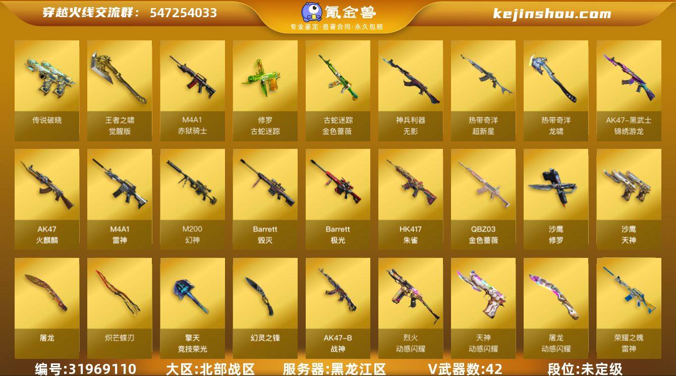 黑龙江区-44V-6王者-0炫金 【传说武器】:传说破晓 【热门武器】:传说破晓,QBZ03-金色蔷薇,HK417-朱雀,M200-幻神,金色蔷薇-古蛇迷踪,修罗-古蛇迷踪,加特林-炼狱,沙鹰-修罗*2,炽芒蝶刃 【音效卡】:天神-动感闪耀 音效卡,M200-幻神音效卡,Barrett-碧霄极光音效卡,炼狱-百战金芒-庆典舞曲音效卡 【皮肤】:幻神-CFS2022,幻神-动感闪耀 皮肤,幻神-电竞之星 皮肤,雷神-荣耀之魄,雷神-维纳斯皮肤,雷神-动感闪耀 皮肤,雷神-源计划2.0专属 皮肤,M4A1-再燃火线,火麒麟-轻羽皮肤,火麒麟-心动糖果,黑龙-暗月,战神-粉色甜心皮肤,AK47-B-常胜将军-刘备,屠龙-星火燎原,轻型军用手斧-再燃火线 【角色】:王者樱-热浪之夏,王者炫,蛇隐宗,奇洋探员,乔伊教练,暗夜-X,初恋灵狐,芳心审判者,嘉年华灵狐,灵狐者-X,灵狐者-黄金海岸,龙儿,麻雀,曼陀罗-X,潘多拉-X,潜龙队-X,蛇姬,斯沃特-X,维纳斯,游珑儿 【人偶武器】:M4A1-雷神-精英刀锋,海滩汪汪-巴雷特,迷你牛牛,深渊终结者手雷,迷你超能女侍 【挑战大师】:AK47-冰龙粉碎者,神圣爆裂者-末日III 【英雄级武器】:AK47-火麒麟,M4A1-雷神*2,HK417-朱雀,无影-神兵利器,黑武士-锦绣游龙,超新星-热带奇洋,金色蔷薇-古蛇迷踪,QBZ03-金色蔷薇,烈火-动感闪耀,王者之武-觉醒版,AK47-B-战神,Barrett-毁灭,Barrett-极光,M200-幻神,加特林-炼狱,炼狱-百战金芒,沙鹰-修罗*2,沙鹰-天神,天神-动感闪耀,修罗-古蛇迷踪,屠龙,幻灵之锋*2,擎天-竞技荣光,炽芒蝶刃,屠龙-动感闪耀,龙啸-热带奇洋,麒麟刺-百战金芒,王者之啸-觉醒版,高爆手雷-幻灵,高爆手雷-竞技荣光,手雷-动感闪耀,高爆手雷-云龙,手雷-热带奇洋,高爆手雷-古蛇迷踪,闪光弹-幻灵,闪光弹-竞技荣光*3,闪光弹-雷霆王者-觉醒版,烟雾弹-幻灵,烟雾弹-竞技荣...