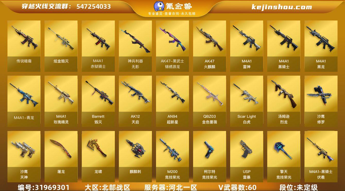 河北一区-63V-4王者-1炫金 【传说武器】:传说暗裔 【热门武器】:传说暗裔,QBZ03-金色蔷薇,Scar Light-白虎,M4A1-青龙,M200-竞技荣光,Cat-刀锋,M4A1-黑骑士,汤姆逊-烈龙*6,斯泰尔-蝴蝶,裁决-雪莉杨,USP-雷暴,沙鹰-修罗*2 【王者炫金武器】:炫金毁灭 【音效卡】:M4A1-黑龙音效卡,M4A1-黑骑士音效卡,Scar Light-白虎音效卡 【皮肤】:雷神-暗月,雷神-星空,雷神-宇航兔皮肤,火麒麟-心动糖果,毁灭-风暴,M4A1-千变-孔明皮肤,黑龙-暗月,黑骑士-伏羲,修罗-能量核心,屠龙-春桃 皮肤,麒麟刺-萌杀皮肤 【角色】:葵,雨棠,电竞教官-云悠悠,王者葵-惊若翩鸿,风暴女,嘉年华灵狐,娟娟,灵狐-花神,灵狐者-X,灵狐者-七夕宝贝,麻雀,曼陀罗-礼服,萌儿,潘多拉-甜心教官,斯沃特-X,铁骑荣耀,兔囡囡,新娜塔莎,雪莉杨-摸金校尉,夜玫瑰-幻能朋克,樱-战斗天使 【人偶武器】:裁决-雪莉杨,斯泰尔-蝴蝶,海滩汪汪-巴雷特,Cat-刀锋,迷你波特博士,夺魂,生化手雷-机甲核心*2,深渊终结者手雷*2,AK47-斯沃特,迷你艾比 【挑战大师】:冰龙粉碎者-白马银枪,激光毁灭者III-白马银枪*2,试炼破坏者III,KAC-圣炎切割者III,神圣爆裂者-末日III 【英雄级武器】:AK47-火麒麟*2,M4A1-黑龙,M4A1-雷神,M4A1-黑骑士,AK12-天启,AN94-超新星,M4A1-青龙,Scar Light-白虎,无影-神兵利器,黑武士-锦绣游龙,M4A1-玫瑰精灵,QBZ03-金色蔷薇,王者冰魄-觉醒版,王者之烈-觉醒版,Barrett-毁灭,M200-竞技荣光,王者星神-觉醒版,悦蓝-惊涛骇浪-觉醒版,汤姆逊-烈龙*6,沙鹰-修罗*2,沙鹰-天神,USP-雷暴,柯尔特-竞技荣光*2,屠龙,龙啸*2,麒麟刺*3,擎天-竞技荣光,高爆手雷-竞技荣光*10,闪光弹-竞技荣光*7,烟雾弹-竞技荣光*7,M4A1-赤狱骑士 【道具】:BS战队炫彩背包,全能枪王背包,炫彩背包...