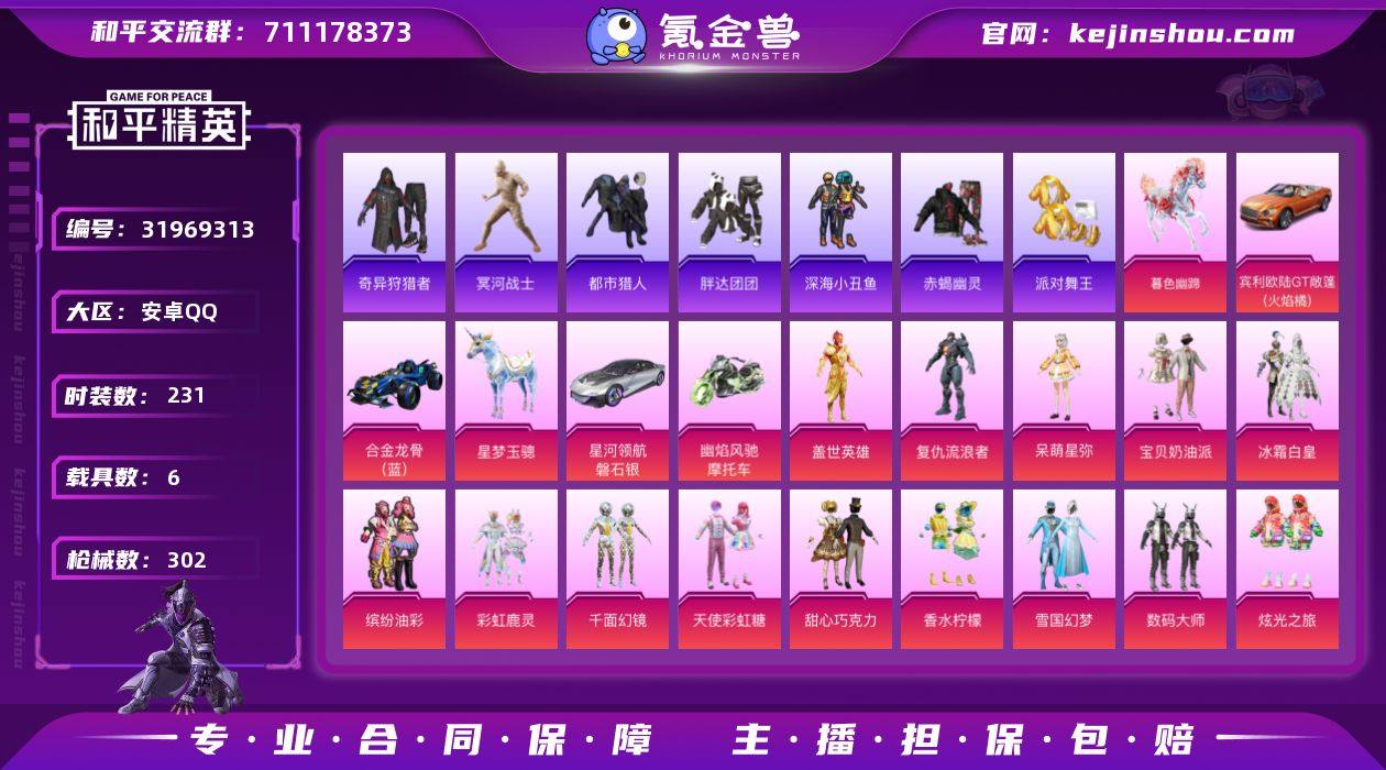 【和平精英】35粉装,29特效枪,6载具,历史最高段位:传奇王牌16星 王牌印记20次 热力值:173308,362套装,475枪械,742装备,287战备;套装:沙丘之主-图卡盟,灵猫魔法师-塞维尔,套装-极限特训,套装-幻影战神,套装-数码大师,套装-银河战甲,套装-怪诞乔克,套装-甜心巧克力,套装-宝贝奶油派,套装-天使彩虹糖,套装-雪国幻梦,套装-梦幻火箭,套装-缤纷油彩,套装-冰霜白皇,套装-彩虹鹿灵,套装-绚金战神,套装-香水柠檬,角色-闪耀迪迦,角色-初号机款机体服,角色-复仇流浪者,套装-千面幻镜,套装-盖世英雄,女娲后裔-赵灵儿,套装-炎氏战神,套装-音爆索尼克,角色-小可学妹,角色-呆萌星弥,套装-炫光之旅,角色-小蓝,角色-美琪,套装-冠军兔兔,角色-初号机 觉醒Ver.,角色-樱桃泡泡,角色-萨利娅,角色-狂魅哈莉,人物-小舞·灵珑,人物-小舞·恋语,套装-猎鹰,套装-黄色运动,套装-蓝色运动,套装-白色伏地魔,套装-黑色伏地魔,套装-深海格斗者,套装-竞技名士,套装-深蓝色名流,套装-猛禽,套装-长空猛禽,套装-漫步者,套装-竞技勇士朋克,套装-黎明保卫者,套装-蓝色守护者,套装-西部风情,套装-旭日情侣,套装-六六大吉,套装-赤蝎幽灵,套装-冷焰舞者,套装-都市猎人,套装-青羽突袭者,套装-水银刺客,套装-浪漫天命,套装-特战装甲,套装-战地菁英,套装-贵族骑装,套装-街舞之王,套装-街舞达人,套装-黄色格斗者,套装-灰色格斗者,套装-活力之心,套装-甜蜜告白,套装-春日漫步,套装-龙腾端午,套装-燃烧卡路里,套装-滨海假日,套装-沙漠毒蛇,套装-鹰眼刺客,套装-冰冻风暴,套装-冷酷挑战者,套装-幻影武者,套装-特战英豪,套装-红潮炫舞,套装-酷萌兔限定,套装-神秘领域,套装-怒火燎原,套装-魅力单车,套装-耀眼新星,套装-狂战萌兔,套装-雪山征服者,套装-坚韧舞者,套装...