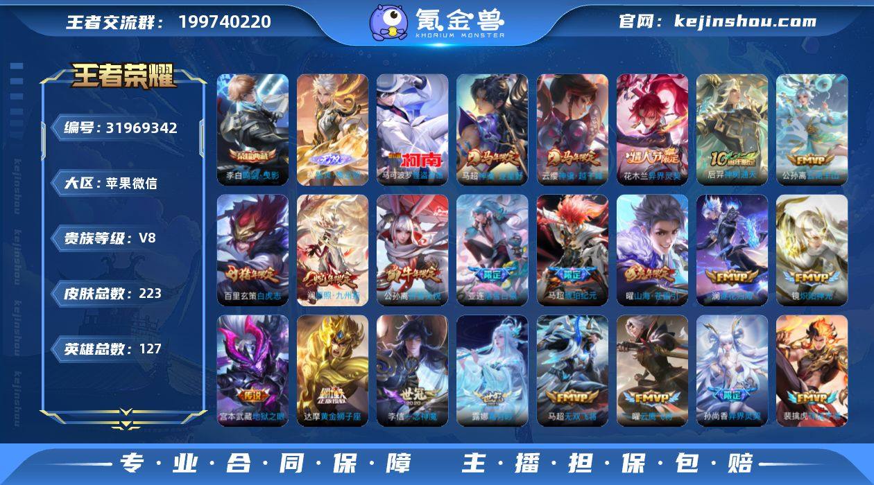 苹果微信贵族8 李白典藏 耀无双 怪盗基德 落雪白狼 云缨年限 祈雪灵祝 1无双 1珍品 1典藏 29传说至尊星耀I段位-127英雄-223皮肤-1典藏皮肤-1无双-1珍品传说-29传说-53史诗 【英雄全皮】:孙权全皮,影全皮 【荣耀典藏】:李白鸣剑曳影 【无双皮肤】:曜器灵螭龙剑 【珍品传说】:马可波罗怪盗基德 【传说皮肤】:云缨神骥越千峰,马超神骥逐星野,花木兰异界灵契,后羿神树通天,公孙离云诺千山,澜愿照九州拓,裴擒虎祥瑞亨通,桑启鸣野蒿,亚连落雪白狼,马超琥珀纪元,澜逐花归海,露娜霜月吟,宫本武藏惊梅引,马可波罗妄想实况,公孙离记忆之芯,曜山海苍雷引,马超无双飞将,孙尚香异界灵契,赵云淬星耀世,公孙离祈雪灵祝,镜炽阳神光,虞姬启明星使,曜云鹰飞将,李信一念神魔,干将莫邪久胜战神,达摩黄金狮子座,百里玄策白虎志,宫本武藏地狱之眼,狄仁杰超时空战士 【限定皮肤】:姜子牙天穹之誓,狄仁杰阴阳师,赵云皇家上将,孙尚香异界灵契,元歌无心,马可波罗山海玄木吟,马可波罗妄想实况,狄仁杰魔术师,项羽海滩派对,虞姬启明星使,黄忠烈魂,百里玄策白虎志,百里玄策原初追逐者,公孙离祈雪灵祝,裴擒虎李小龙,米莱狄胡桃异想国,曜山海苍雷引,蒙犽狂想玩偶喵,鲁班大师探海日志,艾琳女武神,艾琳流音漫舞,司空震地狱燃心,阿古朵江河有灵,张良古海寻踪,鬼谷子天穹祈灯,伽罗琥珀纪元,马超琥珀纪元,亚连落雪白狼,沈梦溪龙舞盛年,刘邦剑破天穹,程咬金群星魔术团,刘备异域游侠,芈月浮光幕影,周瑜熔金海岸 【年限皮肤】:百里玄策白虎志,公孙离祈雪灵祝,曜山海苍雷引,马可波罗山海玄木吟,澜愿照九州拓 【赛季限定】:鲁班大师探海日志,张良古海寻踪,鬼谷子天穹祈灯,刘邦剑破天穹,姜子牙天穹之誓,东皇太一噬灭天穹,太乙真人谧流熔炉,钟馗虚灵犬护,甄姬逆浪荇歌,亚...