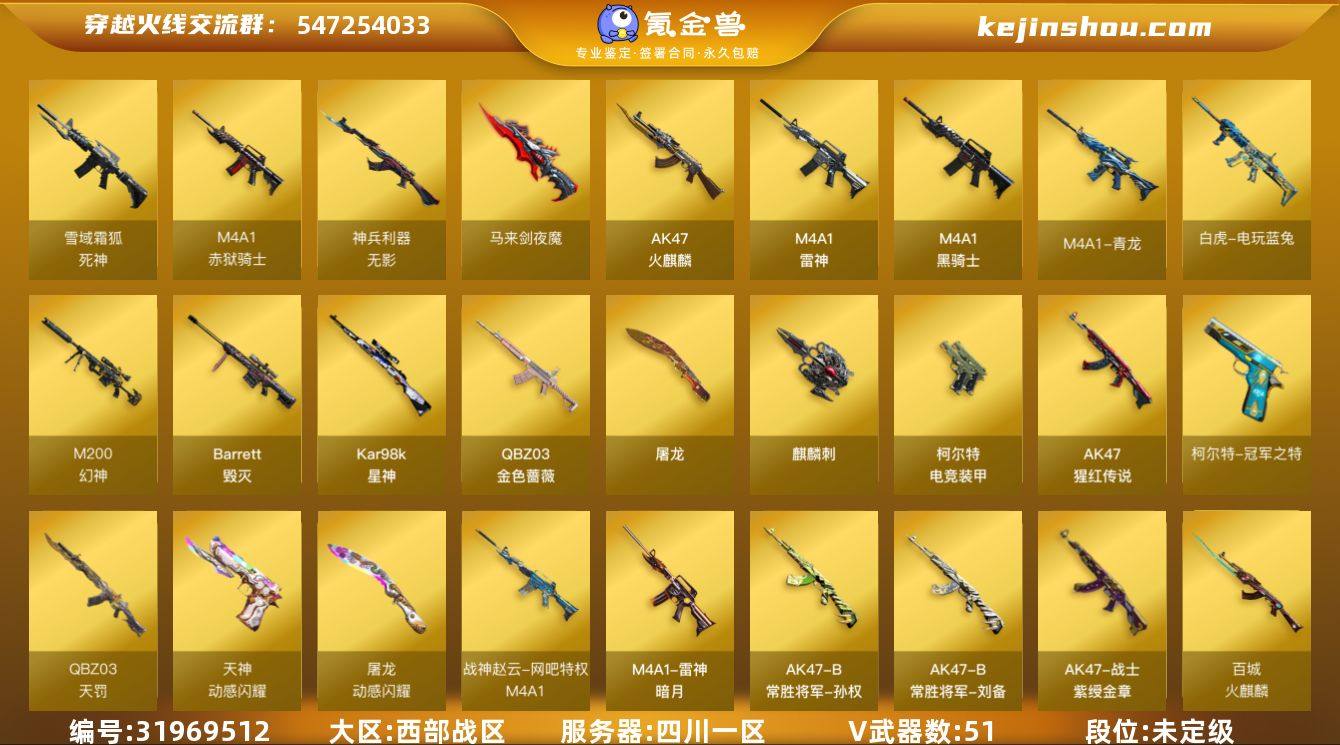 四川一区-54V-0王者-0炫金 【热门武器】:QBZ03-金色蔷薇,M4A1-青龙,M200-幻神,白虎-电玩蓝兔,柯尔特-冠军之特,Kar98K-星神,M4A1-黑骑士,黄金猫猫手套-白鲨 【音效卡】:Barrett-碧霄极光音效卡,白虎-盛典舞曲音效卡,炼狱-百战金芒-庆典舞曲音效卡,沙鹰-修罗-盛典舞曲音效卡,死神-雪域霜狐-怀旧音效卡,女战神梧桐语音包 【皮肤】:M200-幻神-黄忠皮肤,幻神-动感闪耀 皮肤,雷神-暗月,M4A1-战神赵云,M4A1-再燃火线,雷神-神秘按键 皮肤,火麒麟-百城,火麒麟-心动糖果,毁灭-暗月,毁灭-冠军之怒,毁灭-英雄计划 皮肤,战神-紫绶金章皮肤,AK47-B-常胜将军-刘备,AK47-B-常胜将军-孙权,轻型军用手斧-再燃火线 【角色】:雨棠,雪域霜狐,乔伊教练,云海玲珑,暗夜-X,初恋灵狐,芳心审判者,嘉年华灵狐,疾风,娟娟,兰-新年限定,灵狐者-X,龙儿-小淘气,麻雀,女主播,潘多拉-甜心教官,斯沃特-X,铁骑荣耀,新娜塔莎,雪莉杨-摸金校尉 【人偶武器】:AWM-灵狐-15周年嘉年华,迷你超能女侍 【挑战大师】:冰龙粉碎者-白马银枪,激光毁灭者III-白马银枪*3 【英雄级武器】:AK47-火麒麟*2,M4A1-雷神,M4A1-黑骑士,M4A1-青龙,QBZ03-天罚,无影-神兵利器,死神-雪域霜狐,QBZ03-金色蔷薇,AK-47-猩红传说,白虎-电玩蓝兔,Barrett-毁灭,M200-幻神,Kar98K-星神,炼狱-百战金芒,柯尔特-冠军之特,柯尔特-电竞装甲,柯尔特-百战金芒,天神-动感闪耀,屠龙,马来剑-夜魔,麒麟刺,屠龙-动感闪耀,麒麟刺-百战金芒,丛林匕首-玄豹,高爆手雷-夜魔*2,手雷-动感闪耀,高爆手雷-玄豹*3,闪光弹-夜魔,闪光弹-玄豹*3,烟雾弹-夜魔,烟雾弹-玄豹*3,M4A1-赤狱骑士,M4A1-苍鸣雷神,Barrett-碧霄极光 【道具】:AG战队炫彩背包,CFS限定背包,云山科技背包,亚洲杯纪念炫彩背包,炫彩背包-诺拉,百战金芒...