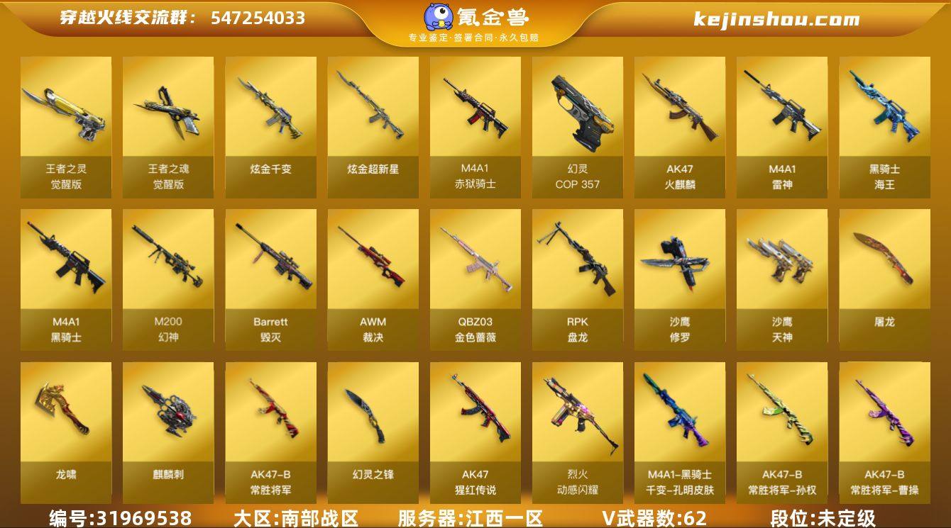 江西一区-64V-7王者-2炫金 【传说角色】:传说星骇 【热门武器】:QBZ03-金色蔷薇,M200-幻神,M4A1-黑骑士,RPK-盘龙,加特林-炼狱,羊驼玩偶,COP 357-幻灵*2,沙鹰-修罗,金刚伞 【王者炫金武器】:炫金千变,炫金超新星,王者之魄闪光弹 【音效卡】:M200-幻神音效卡,AK47-火麒麟音效卡,M4A1-雷神音效卡,M4A1-黑骑士音效卡,绝迹语音包,Barrett-碧霄极光音效卡,炼狱-百战金芒-庆典舞曲音效卡,沙鹰-修罗-盛典舞曲音效卡 【皮肤】:幻神-周瑜皮肤,雷神-烈虎皮肤,M4A1-再燃火线,雷神-神秘按键 皮肤,火麒麟-盘古,毁灭-黑大圣皮肤,毁灭-风暴*2,M4A1-千变-孔明皮肤,战神-粉色甜心皮肤,战神-紫绶金章皮肤,AK47-B-常胜将军-曹操,AK47-B-常胜将军-刘备*2,AK47-B-常胜将军-孙权,极光-能量核心,修罗-能量核心,屠龙-春桃 皮肤,轻型军用手斧-再燃火线 【角色】:影豹,王者-葵-貂蝉,王者涂鸦,蛇隐宗,修道士,电竞少女,虎妞,嘉年华灵狐,兰-海滩派对,兰妹妹,0号玩家,龙儿,潘多拉-X,蛇姬,蜀雪 【人偶武器】:迷你深渊冰龙,迷你波特博士,夺魂,迷你牛牛,生化手雷-机甲核心*2,深渊终结者手雷,闪光弹-小乔,闪光弹-貂蝉,高爆手雷-大乔,迷你艾比 【暴走生化】:超级对讲机 【挑战大师】:冰龙粉碎者-白马银枪,机甲撕裂者III 【英雄级武器】:AK47-火麒麟,M4A1-雷神,M4A1-黑骑士,QBZ03-金色蔷薇,烈火-动感闪耀,AK-47-猩红传说,王者冰魄-觉醒版,王者火魄-觉醒版,黑骑士-海王,AK47-B-常胜将军,Barrett-毁灭,AWM-裁决,M200-幻神,RPK-盘龙,加特林-炼狱,炼狱-百战金芒,沙鹰-修罗,沙鹰-天神*3,COP 357-幻灵*2,Anaconda-玄豹,王者之魂-觉醒版,王者之灵-觉醒版,屠龙*4,龙啸,麒麟刺,幻灵之锋,麒麟刺-百战金芒,王者之锋-觉醒版,丛林匕首-玄豹,高爆手雷-幻灵*7,高爆...