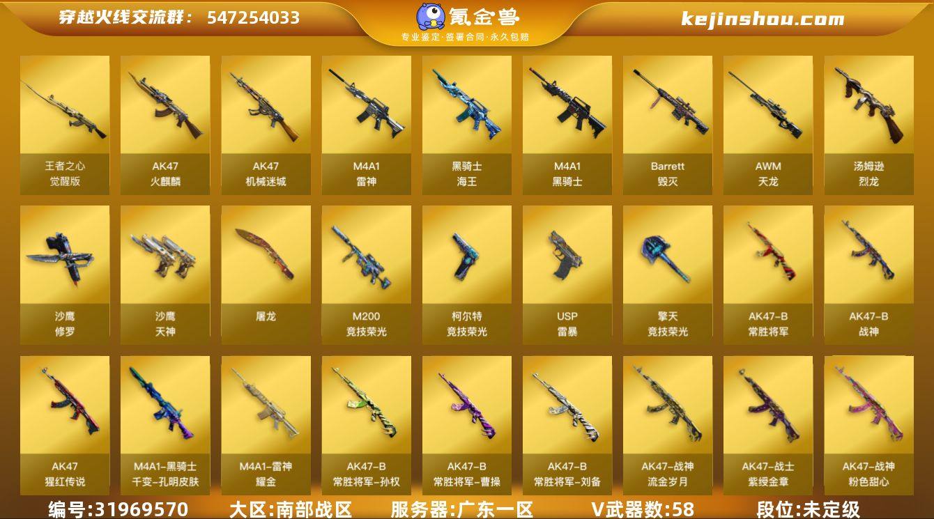 广东一区-59V-1王者-0炫金 【热门武器】:M200-竞技荣光,死亡之眼,M4A1-黑骑士,汤姆逊-烈龙*5,裁决-雪莉杨,USP-雷暴,沙鹰-修罗 【音效卡】:M4A1-雷神音效卡,M4A1-黑骑士音效卡,Barrett-毁灭音效卡 【皮肤】:雷神-耀金皮肤,火麒麟-平天大圣,火麒麟-心动糖果,毁灭-CFS2020,M4A1-千变-孔明皮肤,战神-粉色甜心皮肤,战神-紫绶金章皮肤,战神-流金岁月皮肤,AK47-B-常胜将军-曹操,AK47-B-常胜将军-刘备,AK47-B-常胜将军-孙权 【角色】:电竞教官-云悠悠,王者-瞳-闭月羞花,空,初恋灵狐,芳心审判者,风暴女*2,娟娟,龙儿,龙儿-小淘气,斯沃特-X,新娜塔莎,雪莉杨-摸金校尉 【人偶武器】:裁决-雪莉杨,迷你深渊冰龙,迷你裂空之翼,夺魂,迷你生化手雷,深渊终结者手雷,闪光弹-小乔,闪光弹-貂蝉,高爆手雷-大乔,迷你艾比 【暴走生化】:死亡之眼 【挑战大师】:AK47-冰龙粉碎者,冰龙粉碎者-白马银枪,激光毁灭者III,机甲撕裂者III,神圣爆裂者-末日III,阐释者III 【英雄级武器】:AK47-火麒麟*2,M4A1-雷神*3,M4A1-黑骑士,AK47-机械迷城,王者之心-觉醒版,AK-47-猩红传说,AK47-B-战神,黑骑士-海王,AK47-B-常胜将军,AWM-天龙,Barrett-毁灭,M200-竞技荣光,汤姆逊-烈龙*5,沙鹰-修罗,沙鹰-天神*2,USP-雷暴,柯尔特-竞技荣光,屠龙,擎天-竞技荣光,高爆手雷-雷霆,高爆手雷-幻灵*3,高爆手雷-竞技荣光*6,闪光弹-雷霆,闪光弹-幻灵,闪光弹-竞技荣光*6,烟雾弹-雷霆,烟雾弹-竞技荣光*7 【道具】:炫彩背包,背包-洛丽塔,虎牙炫彩背包,超级背包,妩媚妖姬,绿色巨人,灵魂忍者*2,变异宝贝,妖姬,迷雾幽灵,生化弹匣,夺命之镰,防化服*3,金色流光-枪王排位,星辰流光-枪王排位,零-水下丽影表情,防弹头盔*5,防弹衣*5,C4工具钳*4,手雷包*4 【特殊枪械】:1黑骑士,5烈龙