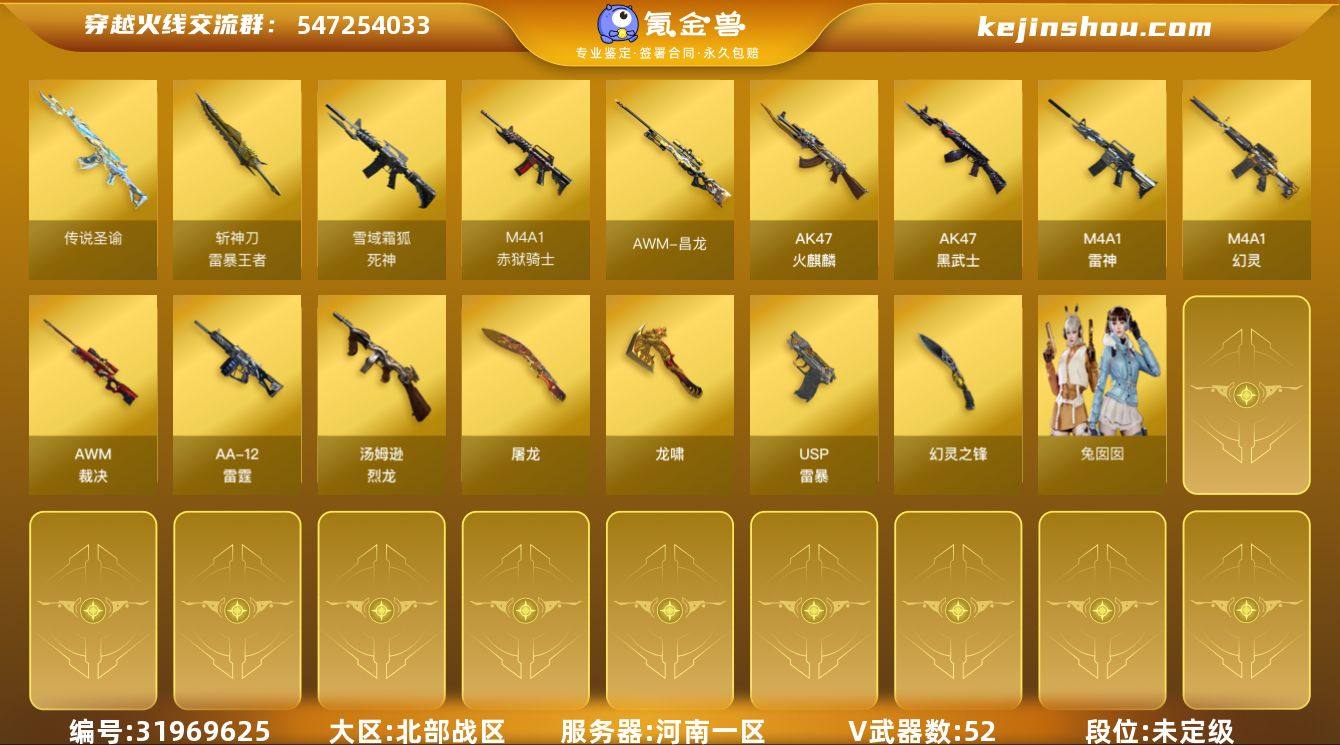 河南一区-56V-6王者-0炫金 【传说武器】:传说圣谕 【传说角色】:传说星骇 【热门武器】:传说圣谕,死亡之眼,汤姆逊-烈龙*5,USP-雷暴,柯尔特-赛博朋克 【王者炫金武器】:AK47-雷暴王者,王者森力,王者玉锋,斩神刀-雷暴王者 【音效卡】:AWM-裁决音效卡,Barrett-碧霄极光音效卡,炼狱-百战金芒-庆典舞曲音效卡,死神-雪域霜狐-怀旧音效卡,柯尔特-百战金芒-庆典舞曲音效卡 【皮肤】:裁决-叶芒苍灵 皮肤,雷神-宇航兔皮肤,M4A1-再燃火线,屠龙-春桃 皮肤,龙啸-纸灯龙皮肤,轻型军用手斧-再燃火线 【角色】:玄豹,战地猎狐,雪域霜狐,风暴女,龙儿,龙儿-小淘气,玫瑰花神,潘多拉-X,斯沃特-X,铁骑荣耀,兔囡囡 【人偶武器】:迷你钢铁终结者,异变清道夫-蛇影双骄,AWM-灵狐-15周年嘉年华,生化手雷-机甲核心 【暴走生化】:死亡之眼 【英雄级武器】:AK47-火麒麟,M4A1-雷神,AK47-黑武士,M4A1-幻灵,死神-雪域霜狐,SCAR Light-玄豹,王者猎神-觉醒版,AWM-裁决,王者之光-觉醒版,炼狱-百战金芒,汤姆逊-烈龙*5,AA-12-雷霆,USP-雷暴,Anaconda-玄豹,USP-冥王*2,屠龙,龙啸,幻灵之锋*2,麒麟刺-百战金芒,丛林匕首-玄豹,高爆手雷-幻灵*2,高爆手雷-玄豹*5,闪光弹-幻灵*2,闪光弹-玄豹*5,烟雾弹-幻灵*2,烟雾弹-玄豹*5,M4A1-赤狱骑士,M4A1-苍鸣雷神,AWM-昌龙,Barrett-碧霄极光 【道具】:BS战队炫彩背包,云山科技背包,亚洲杯纪念炫彩背包,炫彩背包-诺拉,百战金芒炫彩背包,雪域霜狐炫彩背包,圣拳猎手-炽雪,女皇终结者-魔龙之吻,救世主-黑桃战神,黄金生化钩,绿色巨人,灵魂忍者*2,变异宝贝,妖姬,迷雾幽灵,夺命之镰,防化服*3,金色流光-枪王排位,星辰流光-枪王排位,流光-鎏金之域,流光-再燃火线,枪王排位28赛季金色流光,枪王排位29赛季金色流光,语音特效-盛典烟火...