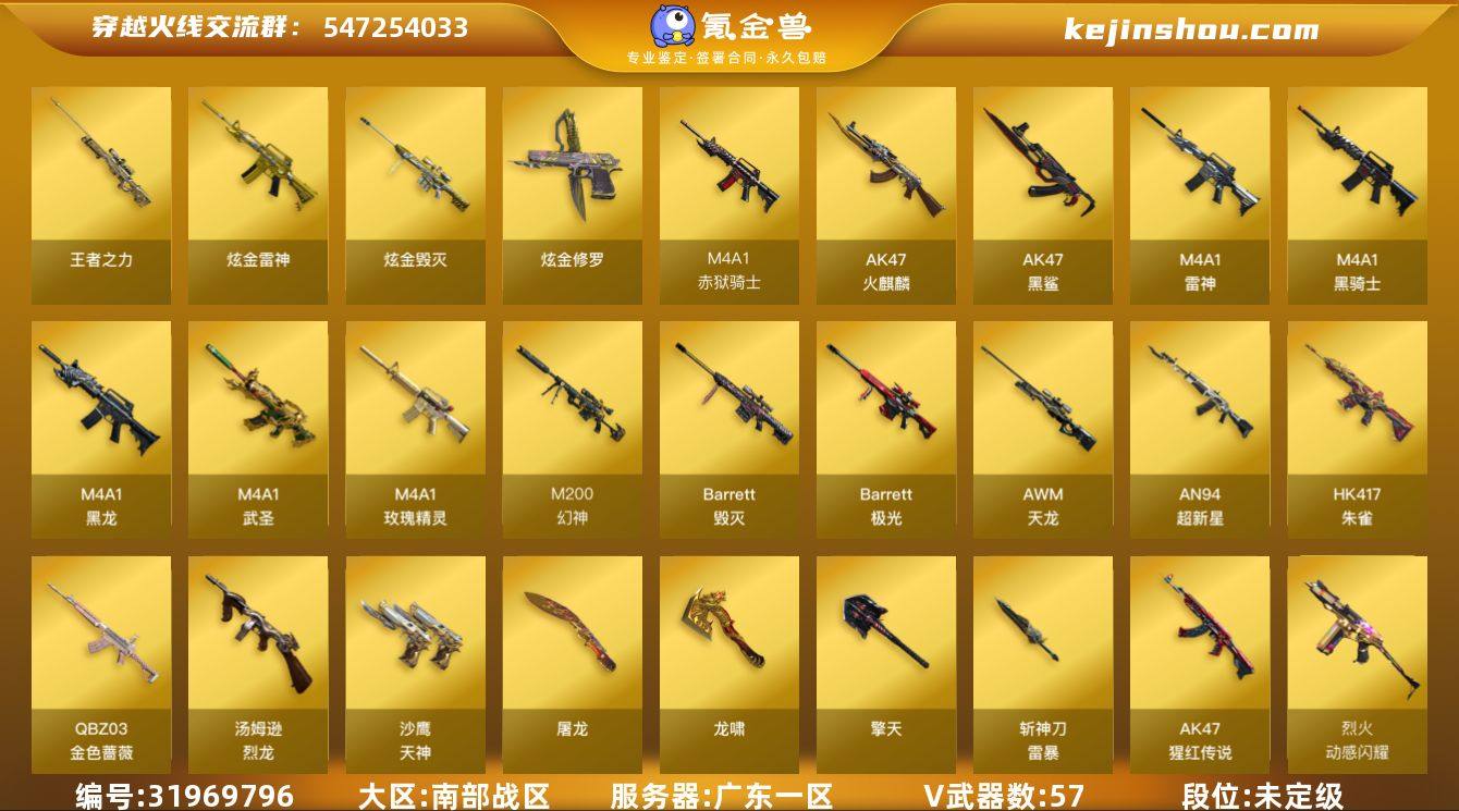 广东一区-62V-4王者武器数-3炫金武器数 【热门武器】:QBZ03-金色蔷薇*3,HK417-朱雀,M200-幻神,M4A1-黑骑士*2,汤姆逊-烈龙*2,Knife-冠军之刃 【王者炫金武器】:王者之力,炫金雷神,炫金毁灭,炫金修罗 【皮肤】:M200-幻神-黄忠皮肤,幻神-冠军之幻,幻神-荣耀世冠EP 皮肤,QBZ03-荣耀世冠白鲨,QBZ03-巅峰荣耀皮肤,QBZ03-荣耀世冠EP 皮肤,烈龙-星空,雷神-荣耀之魄,雷神-星空,雷神-虎将,雷神-维纳斯皮肤,火麒麟-华夏之心,火麒麟-平天大圣,毁灭-星空*2,毁灭-冠军之怒,黑骑士-AG-S4冠军典藏,黑骑士-破浪10年皮肤,无影耀金皮肤,修罗-能量核心*2 【角色】:葵,妮妮,王者凌霄,乔伊教练,初恋灵狐,电竞少女,芳心审判者,风暴女,兰-海滩派对,灵动武士,灵狐-花神,灵狐者-X,灵狐者-职业经理,曼陀罗-礼服,铁骑荣耀,维纳斯,幽,游珑儿 【人偶武器】:白虎-迷你小艾 【挑战大师】:神圣爆裂者III,激光毁灭者III 【英雄级武器】:AK47-火麒麟,M4A1-黑龙*3,M4A1-雷神*2,M4A1-黑骑士*2,AN94-超新星*2,M4A1-武圣*2,AK47-黑鲨,HK417-朱雀,M4A1-玫瑰精灵,QBZ03-金色蔷薇*3,烈火-动感闪耀,AK-47-猩红传说,王者白虎-觉醒版,王者芳薇-觉醒版,AWM-天龙,Barrett-毁灭,Barrett-极光,M200-幻神,王者之力-觉醒版,汤姆逊-烈龙*2,沙鹰-天神*5,天神-动感闪耀,屠龙*3,龙啸*2,擎天,屠龙-动感闪耀,斩神刀-雷暴,高爆手雷-雷霆,高爆手雷-雷暴*2,手雷-动感闪耀,高爆手雷-云龙,闪光弹-雷霆,闪光弹-雷暴*2,闪光弹-云龙,烟雾弹-雷霆,烟雾弹-雷暴*2,烟雾弹-云龙,烟雾弹-荣耀世冠EP,M4A1-赤狱骑士 【道具】:炫彩背包,哔哩哔哩名片,女皇终结者-魔龙之吻,救世主-黑桃战神,绿色巨人,灵魂忍者,迷雾幽灵,夺命之镰,防化服*2,金色流光-枪王排位*2,星辰流光-枪王排位,流光-...